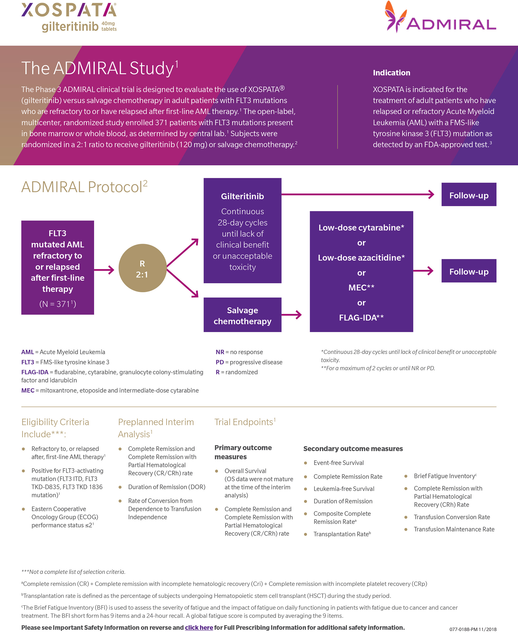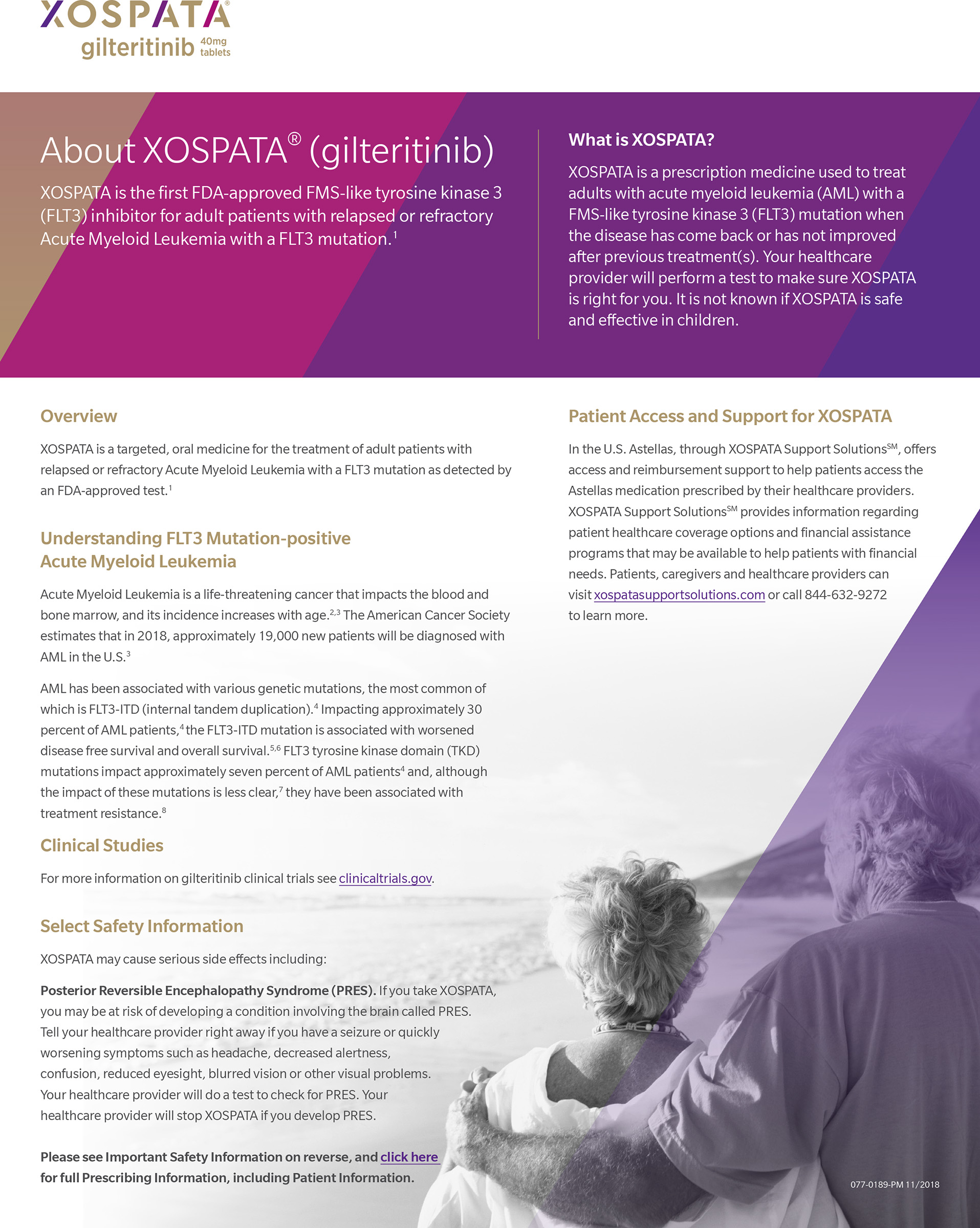 13Astellas Pharma Inc. Astellas Announces Approval in Japan for XOSPATA® 40 mg Tablets for the Treatment of FLT3mut+ Relapsed or Refractory AML (09-21-2018). https://www.astellas.com/us/news/14271. Accessed 11-21-2018.