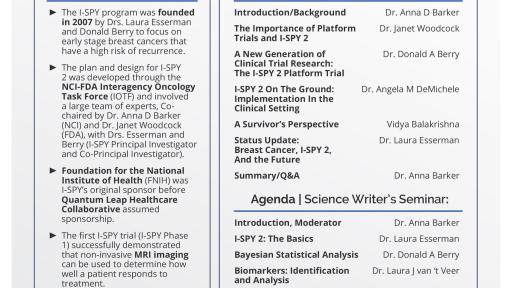 “Having been involved with I-SPY 2 from its beginning, I believe that I-SPY 2 represents a new generation of clinical trials that puts patients and their specific disease at the center of what I really a “smart trial”. It has already served as the prototype for new adaptive platform trials in pancreas and glioblastoma as well as other diseases such as Alzheimer ’s disease. This is the future of clinical trials for many reasons, but the best news is that it is preventing disease progression, curing more patients, and brings the best of what we learn in research to clinical care,” said Anna Barker, Chair of the I-SPY 2 Oversight Group, Board Member, Quantum Leap Healthcare Collaborative and Co-Director and Professor at Arizona State University.