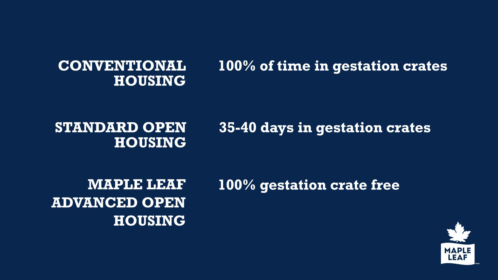 “We have a bold vision to be the most sustainable protein company on earth and our investments and actions to become a leader in animal care are critical to advancing our progress,” said Michael H. McCain, president and CEO, Maple Leaf Foods. “Our research and investment in an advanced open sow housing system is best in class in North America, leading to significantly better lives for the animals and, combined with our expertise in raising animals without antibiotics, provides a unique market advantage for Maple Leaf.”
