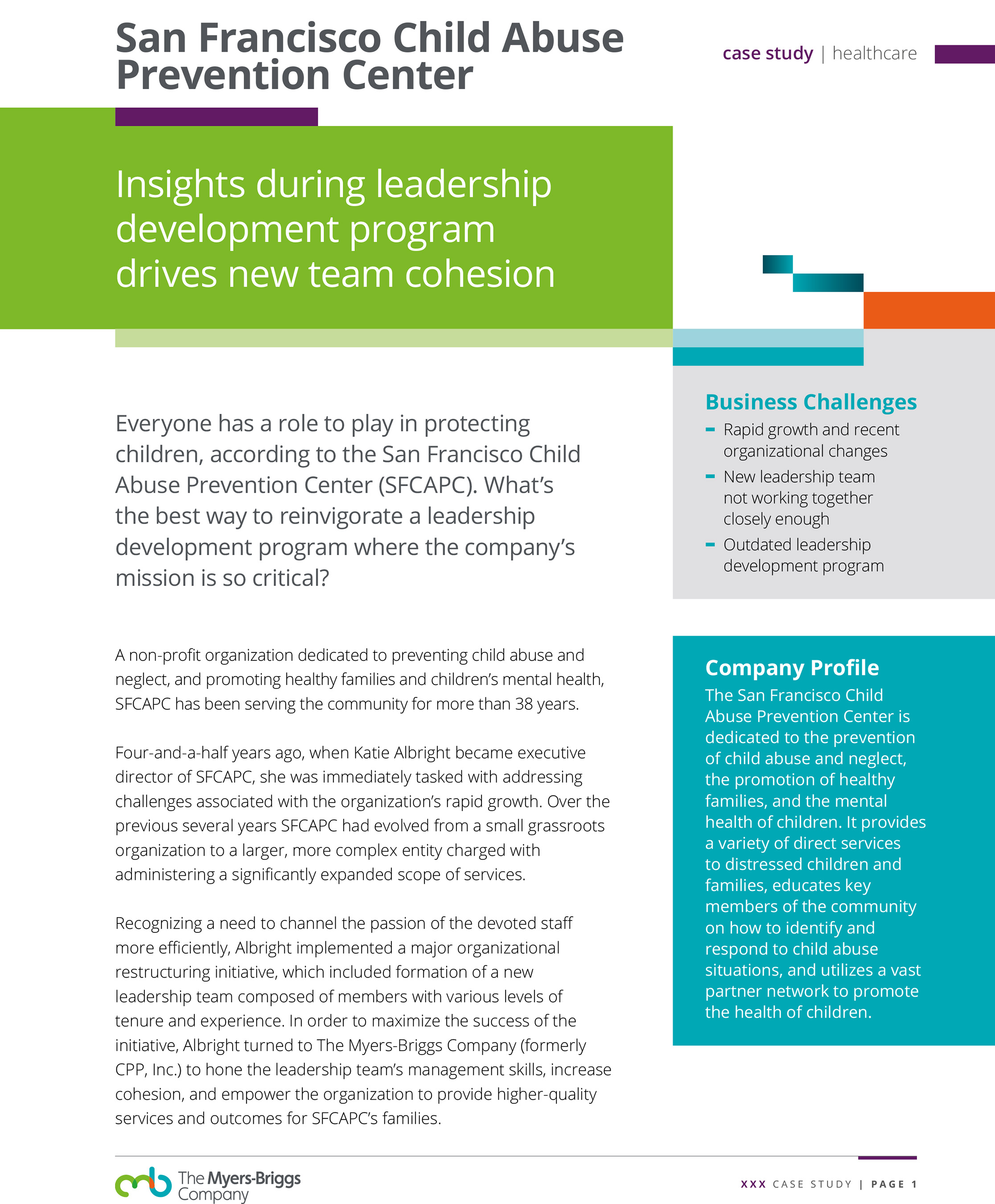 How can we help?Sunnyvale, CA, Oct. 18, 2018 -- Recently merged CPP, Inc. and OPP announced today at the PeopleFWD 2018 conference that they are now officially The Myers-Briggs Company, a Certified B Corporation®. Building on 90 years of deep organizational expertise and product development, the company aims to change the learning and development landscape by empowering people to harness their full potential at work, at home and everywhere in between, and by helping organizations get the best from their people. As a one-stop provider of learning and development services with a global network of offices and partners, and clients that include 88 of the Fortune 100, The Myers-Briggs Company works with organizations in all industries to solve the most complex “people challenges”.