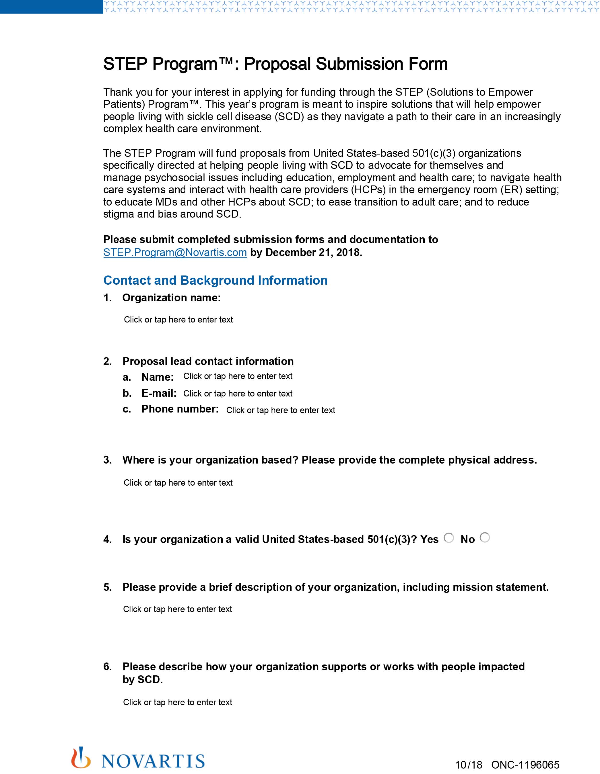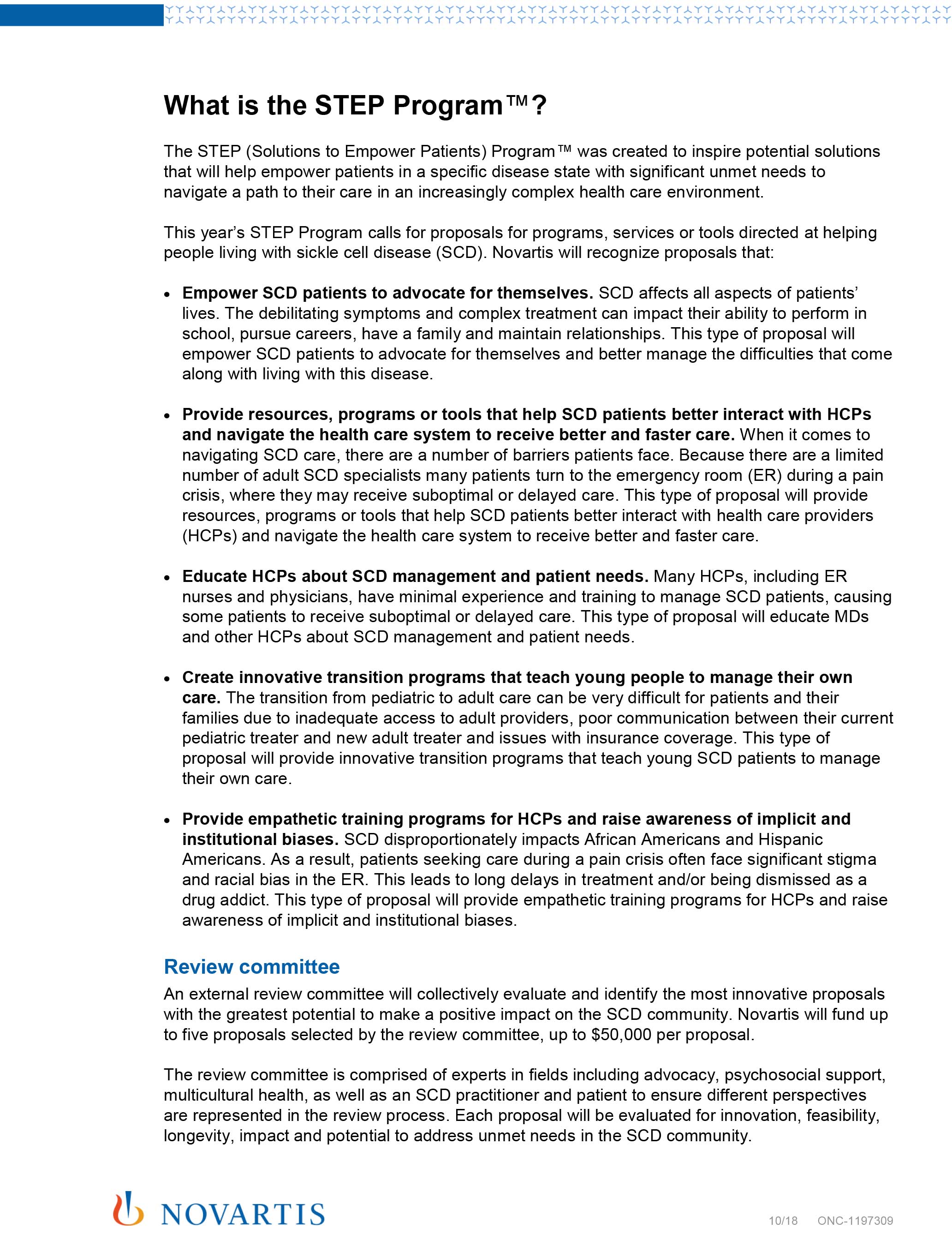 - 2018 STEP Program™ designed to support unique proposals from nonprofit organizations that serve people living with sickle cell disease