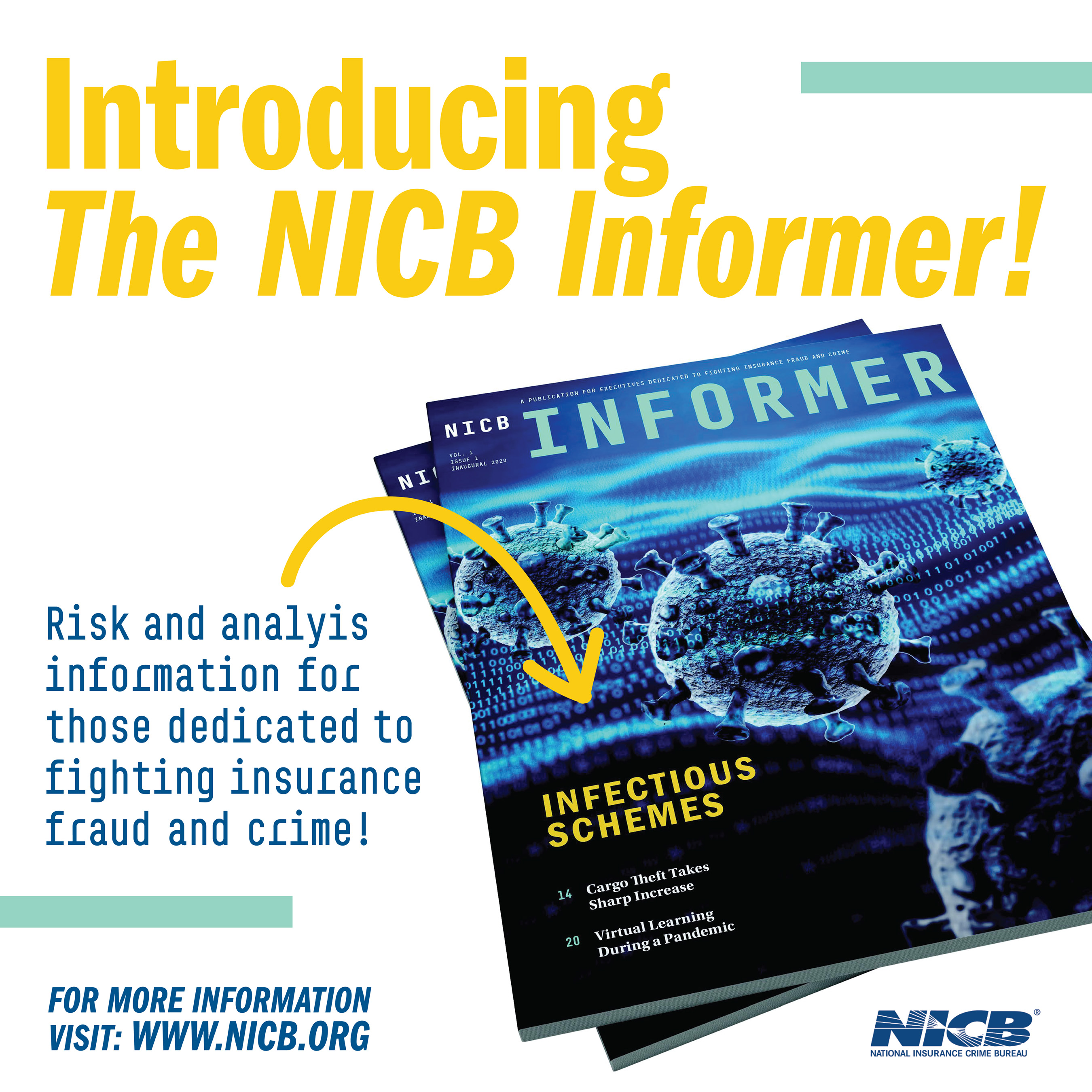 The NICB Informer is a first-of-its-kind publication primarily dedicated to insurance crime, fraud, and threats. In this inaugural edition, articles range from the impact of COVID-19 on insurance crime, cargo theft, cybercrime, business interruption insurance, and fraud concerns.