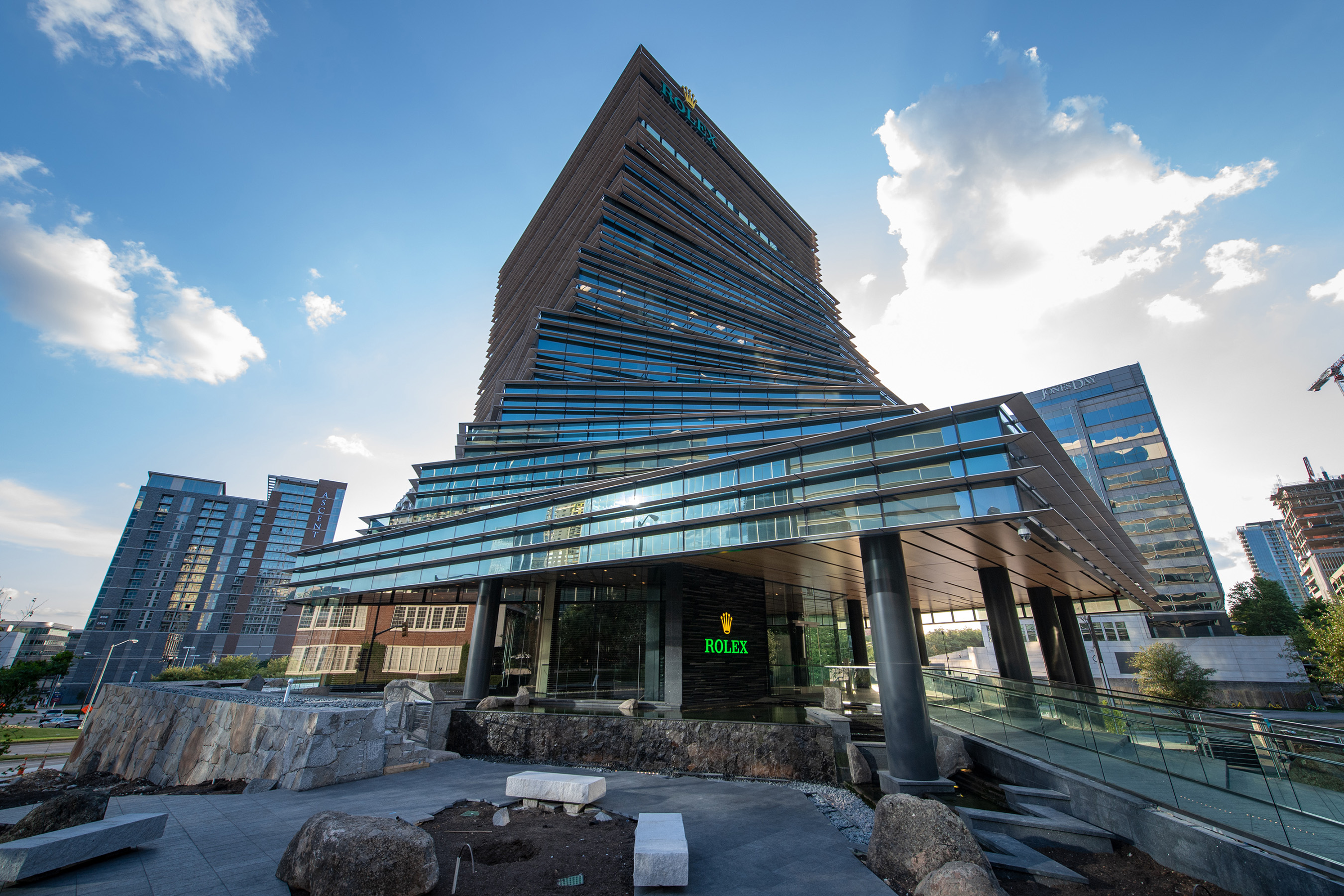 Harwood District has earned a Walk Score of 92, and recently opened a direct connection to the 3.5-mile Katy Trail for its tenants, residents, and visitors. New additions are Bleu Ciel, a 33-story condominium tower designed by Paris-based Jean-Michel Wilmotte and Dallas-based HDF, and the new Rolex Building designed by Tokyo-based Kengo Kuma and Dallas-based HDF.