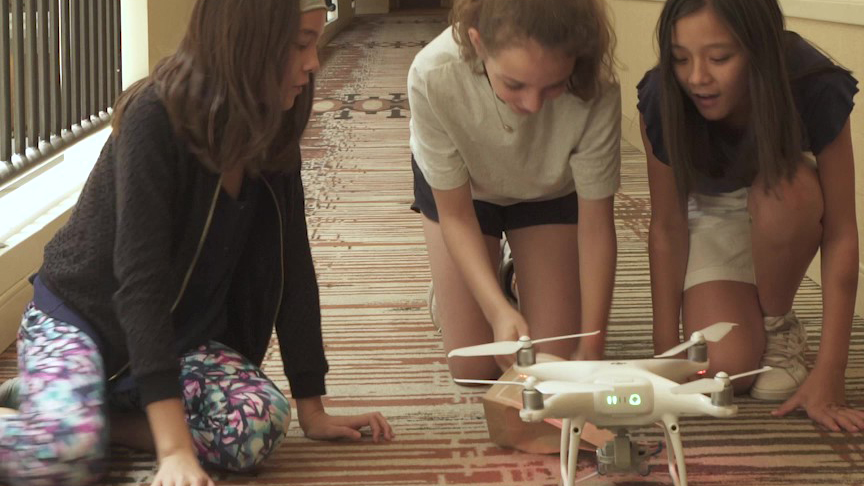 At the hotel, in addition to transforming a suite into outer space, Girlstart participants had fun using science and technology to accomplish a series of everyday tasks in new ways. The girls delivered a package across the hotel’s expansive atrium using a drone and even cooked a “made-to-order” egg breakfast – just like Embassy Suites by Hilton’s omelet chefs do every day – using a solar oven. The group finished the day with an underwater robo-race obstacle course in the hotel’s pool.
