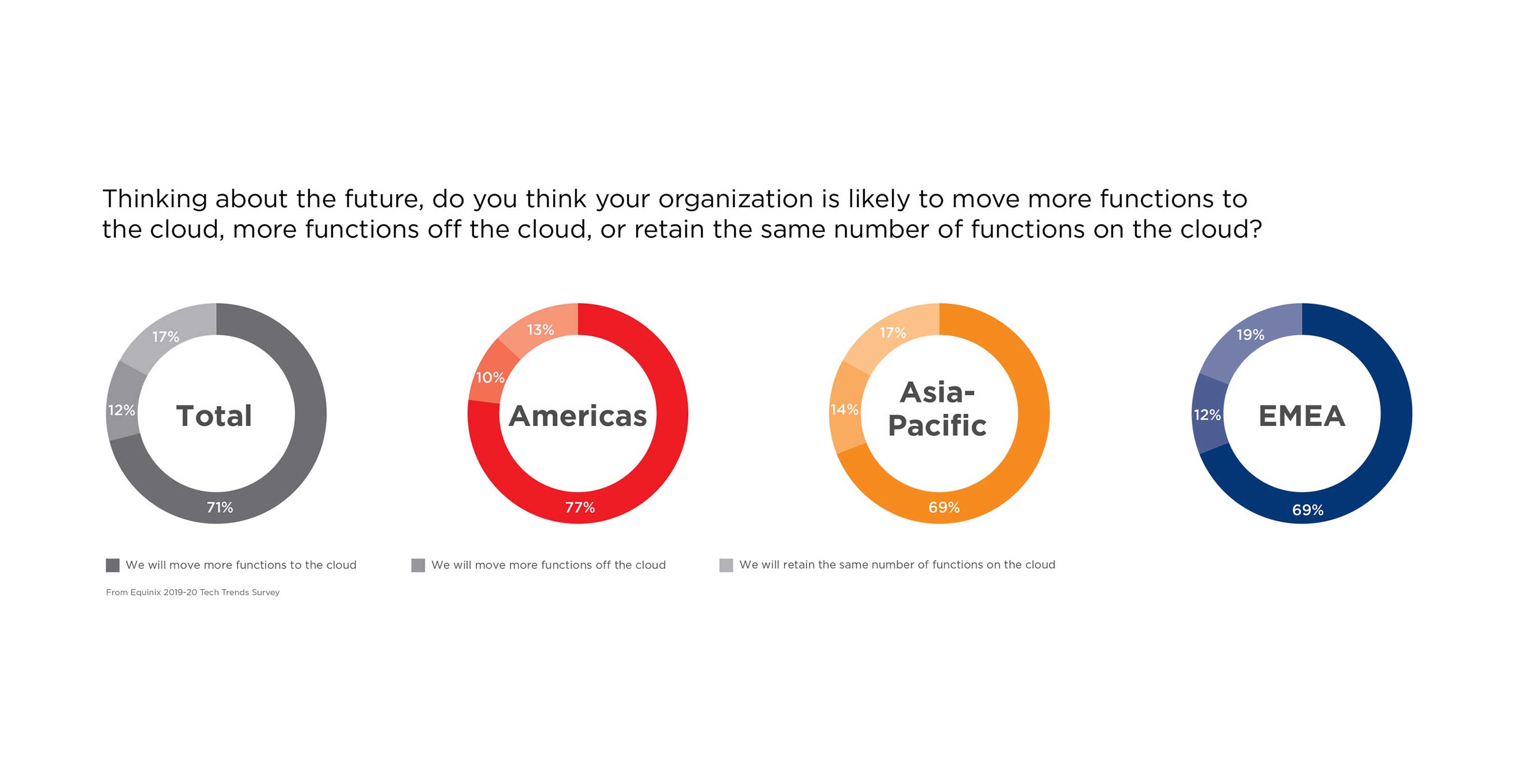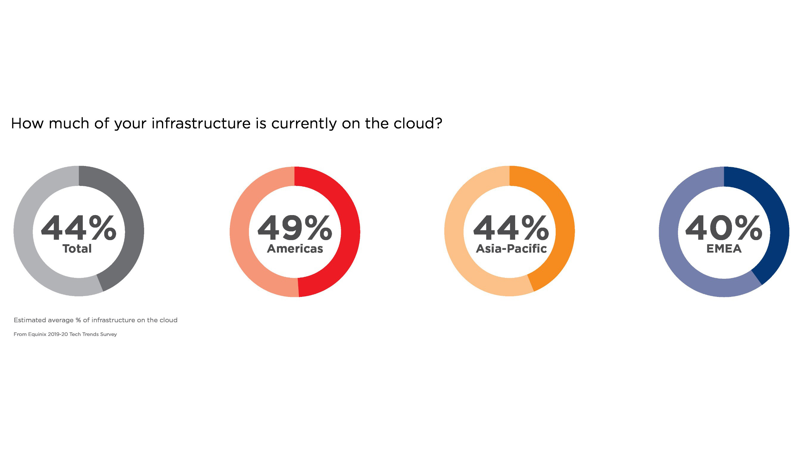 - Globally, 44% of IT infrastructure is currently on the cloud. In the Americas this figure is higher at 49%, while in EMEA it is just 40%. Asia-Pacific matches the global average at 44%.