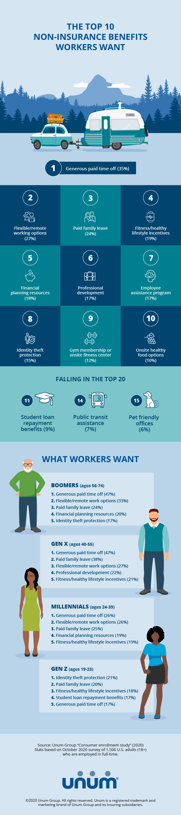 CHATTANOOGA, Tenn. (Dec. 11, 2020) — The top three perks workers want from their employers have to do with time away from the office, according to new research from employee benefits provider Unum (NYSE: UNM). Paid time off, flexibility or remote working options, and paid family leave are the top non-insurance employee benefits among U.S. workers.