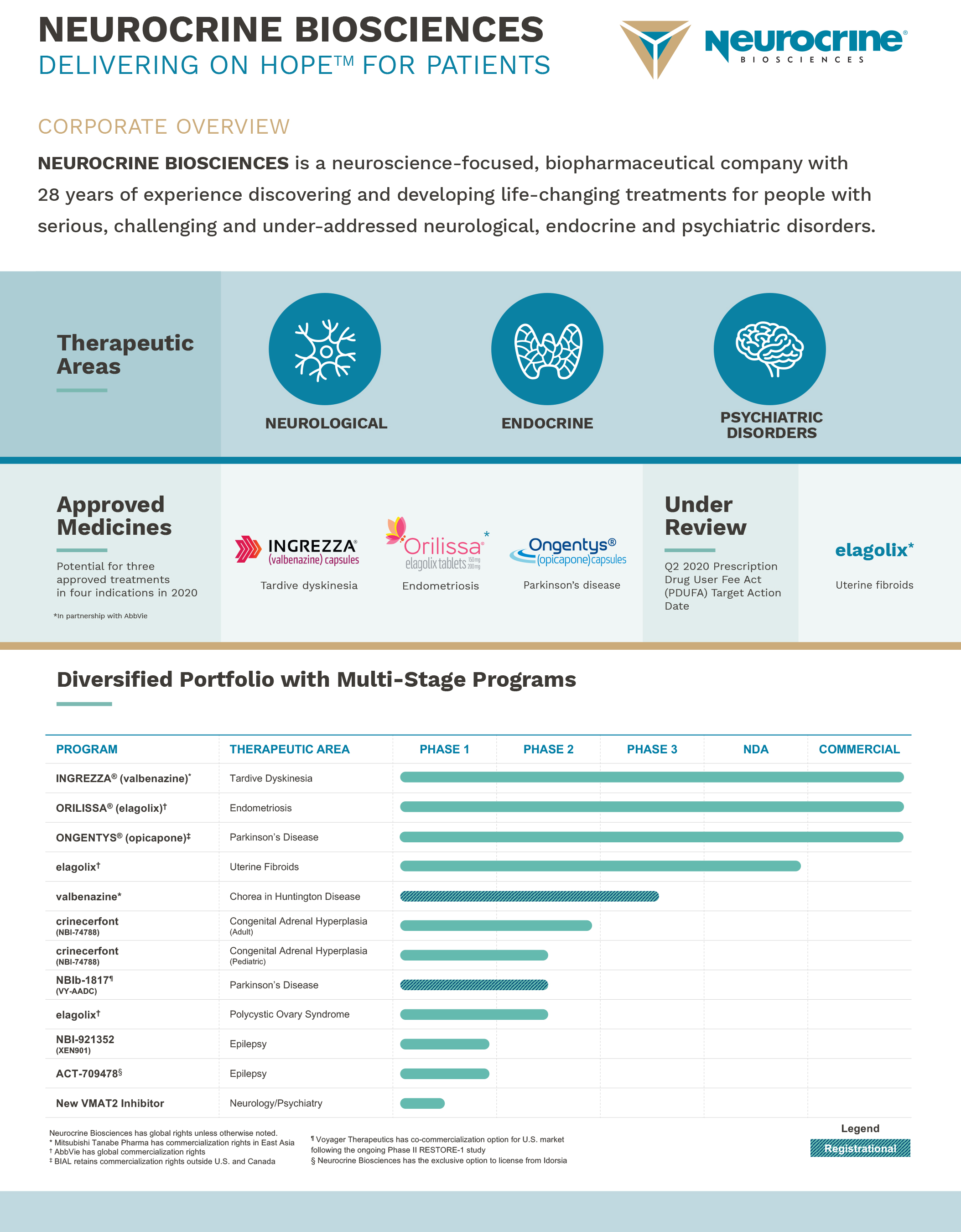 Neurocrine Biosciences is a neuroscience-focused, biopharmaceutical company with 28 years of experience discovering and developing life-changing treatments for people with serious, challenging and under-addressed neurological, endocrine and psychiatric disorders. The company's diverse portfolio includes FDA-approved treatments for tardive dyskinesia, Parkinson’s disease and endometriosis* and clinical development programs in multiple therapeutic areas including a gene therapy for Parkinson's disease, chorea in Huntington disease, congenital adrenal hyperplasia, epilepsy, uterine fibroids* and polycystic ovary syndrome*. Headquartered in San Diego, Neurocrine Biosciences specializes in targeting and interrupting disease-causing mechanisms involving the interconnected pathways of the nervous and endocrine systems. For more information, visit neurocrine.com, and follow the company on LinkedIn. (*in collaboration with AbbVie)