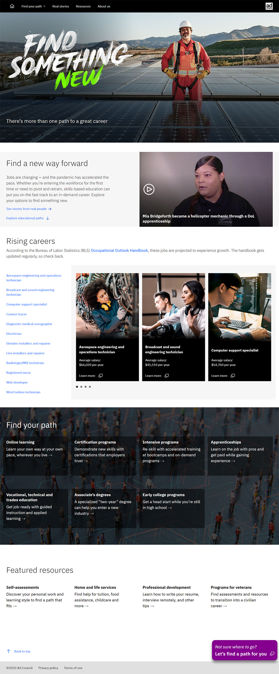 The ads direct audiences to FindSomethingNew.org, a new website with resources to help students and adults across the U.S. identify and pursue the right path for their career goals. The website offers an interactive tool that recommends education pathways for each user, information about rising careers to consider and a directory of resources for life services like childcare, food assistance and internet access. Pathways featured include online learning, professional certification programs, associate’s degrees and vocational, technical and trades education.
