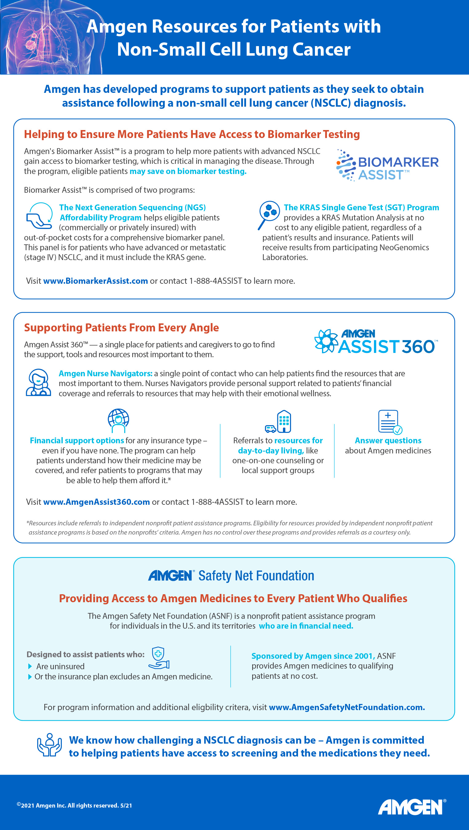 Amgen is committed to supporting patients with NSCLC and to helping appropriate patients with affordable access to LUMAKRAS. Patients, caregivers and physicians who need support, tools or resources can contact Amgen Assist360™ (1-888-4ASSIST). Amgen also provides patient assistance for its medicines marketed in the U.S. in a variety of ways, including free medicines through the Amgen Safety Net Foundation for qualifying individuals with no or limited drug coverage.