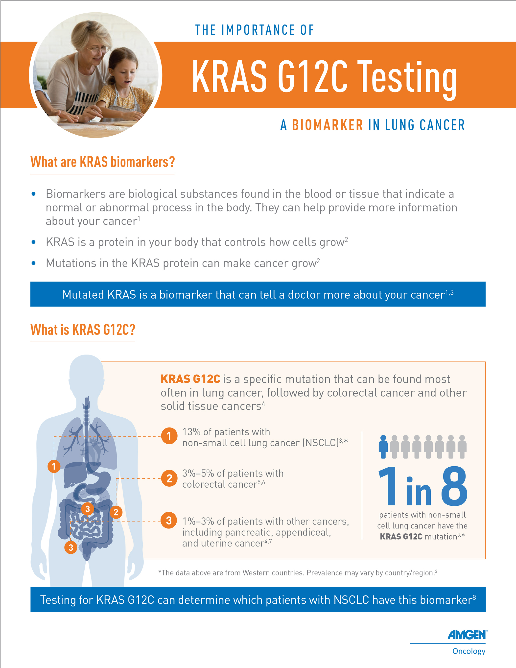 Amgen has partnered with two companies—Guardant Health and QIAGEN—to develop blood- and tissue-based companion diagnostics (CDx), respectively, for LUMAKRAS. With the addition of these tests, patients and clinicians will have more options and flexibility for conducting KRAS G12C biomarker testing.