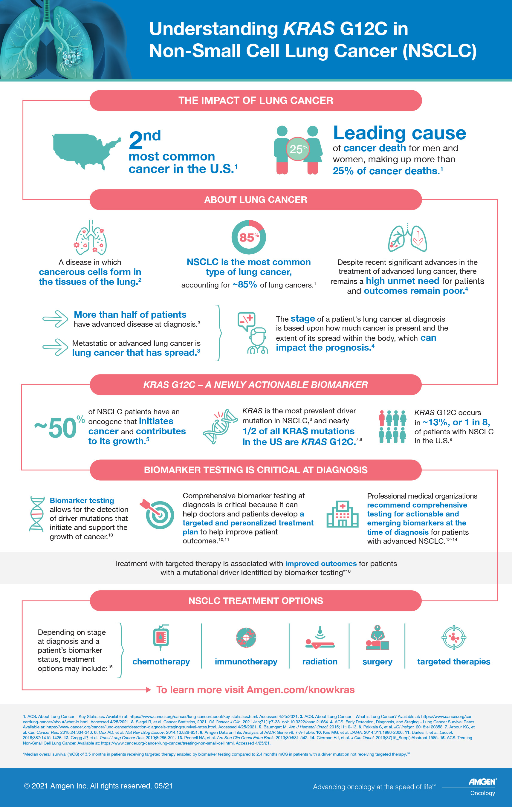 “Biomarker testing for patients with non-small cell lung cancer is critical because it informs a patient’s treatment path with a personalized and tailored approach. The only way to identify the KRAS G12C mutation is to test for it, so I urge patients to ask their care teams about comprehensive biomarker testing. It is important that patients and their healthcare providers know that KRAS G12C is now an actionable mutation,” said Andrea Ferris, president and CEO of LUNGevity. “Today’s FDA approval of a therapy targeted for KRAS G12C, one of the most prevalent biomarkers in non-small cell lung cancer, brings hope to the many patients who carry this mutation and is a significant moment for the lung cancer community who need more innovative treatment options.”