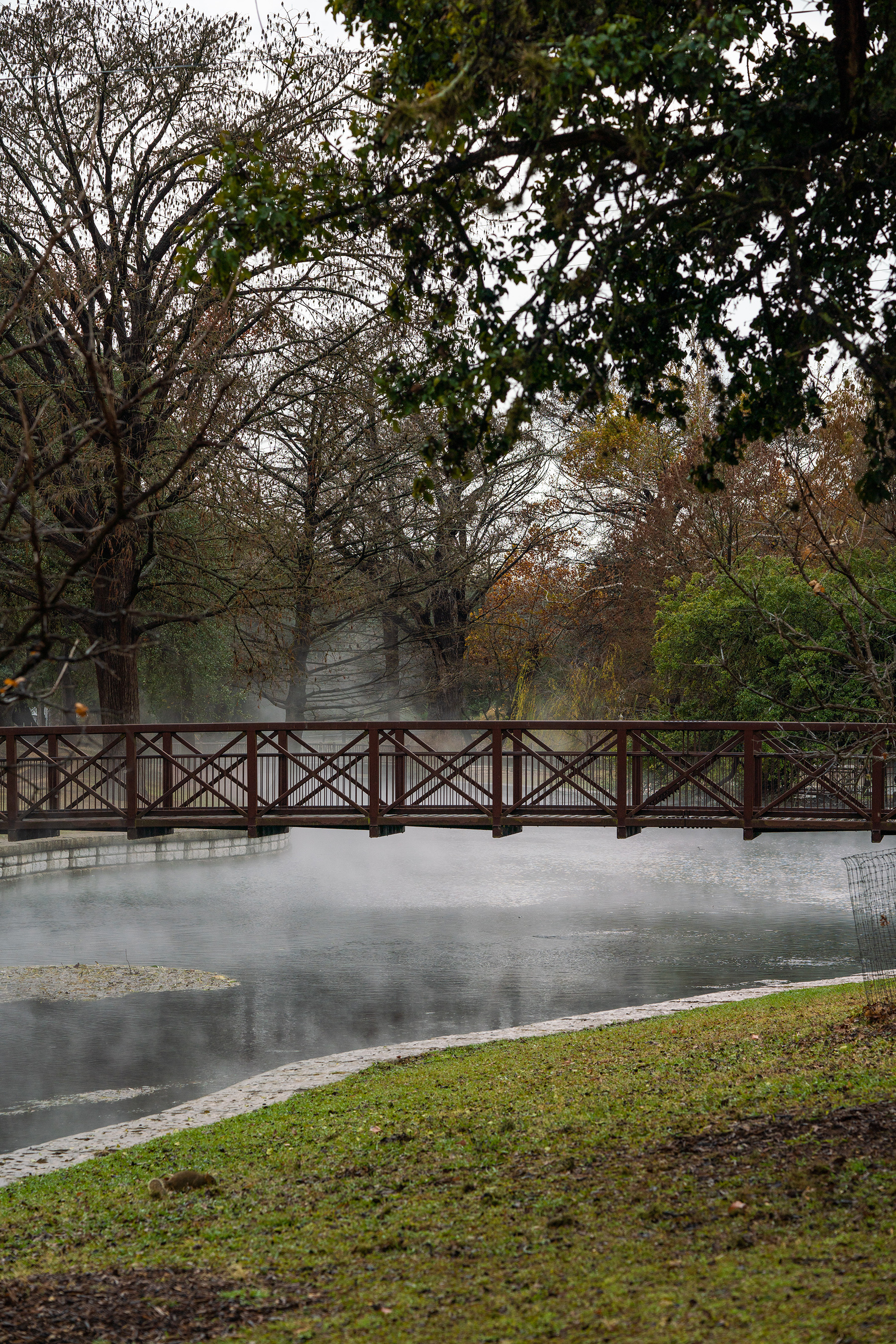The 72 degree spring-fed lake creates steam on a wintery day. New Braunfels boasts over 550 acres of parks and green space for outdoor recreation.