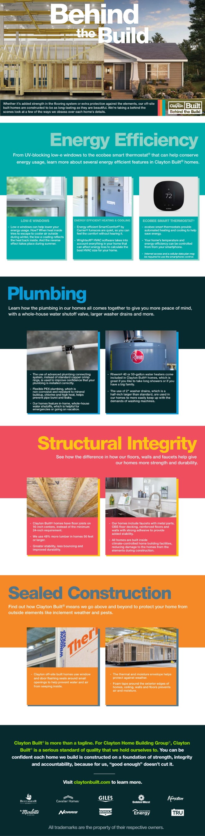 The Behind the Build digital experience is part of the larger Clayton Built® Promise of strength, integrity and accountability. All Clayton Built® homes are a step above standard federal guidelines, and include the following features that improve overall quality, efficiency and durability: