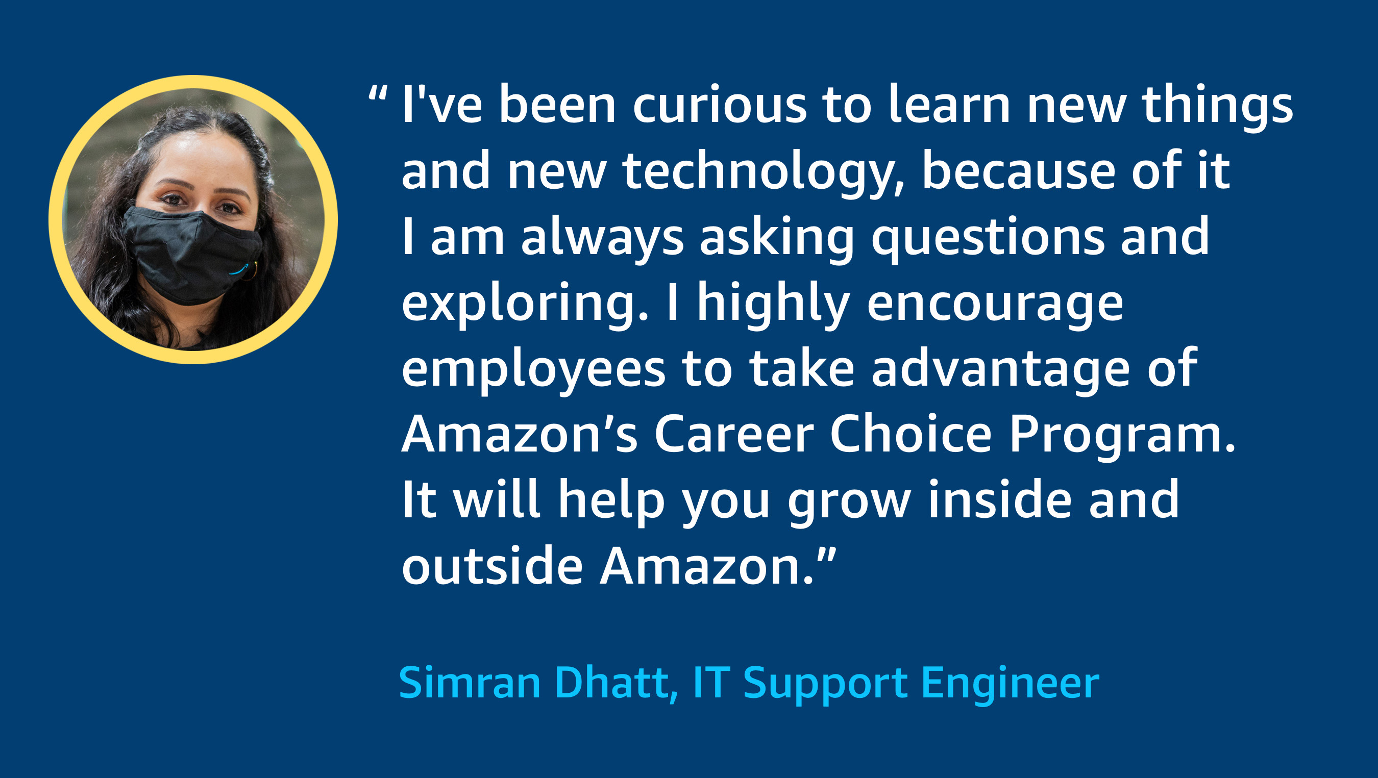 - Simran Dhatt, IT Support Engineer: “I started as a temporary employee in 2015 and since then had a chance to work with most of the departments. With these experiences, I became self-dependent and self-confident. I've been curious to learn new things and new technology, and because of it I am always asking questions and exploring. I highly encourage employees to take advantage of Amazon’s Career Choice Program. It will help you grow inside and outside Amazon”