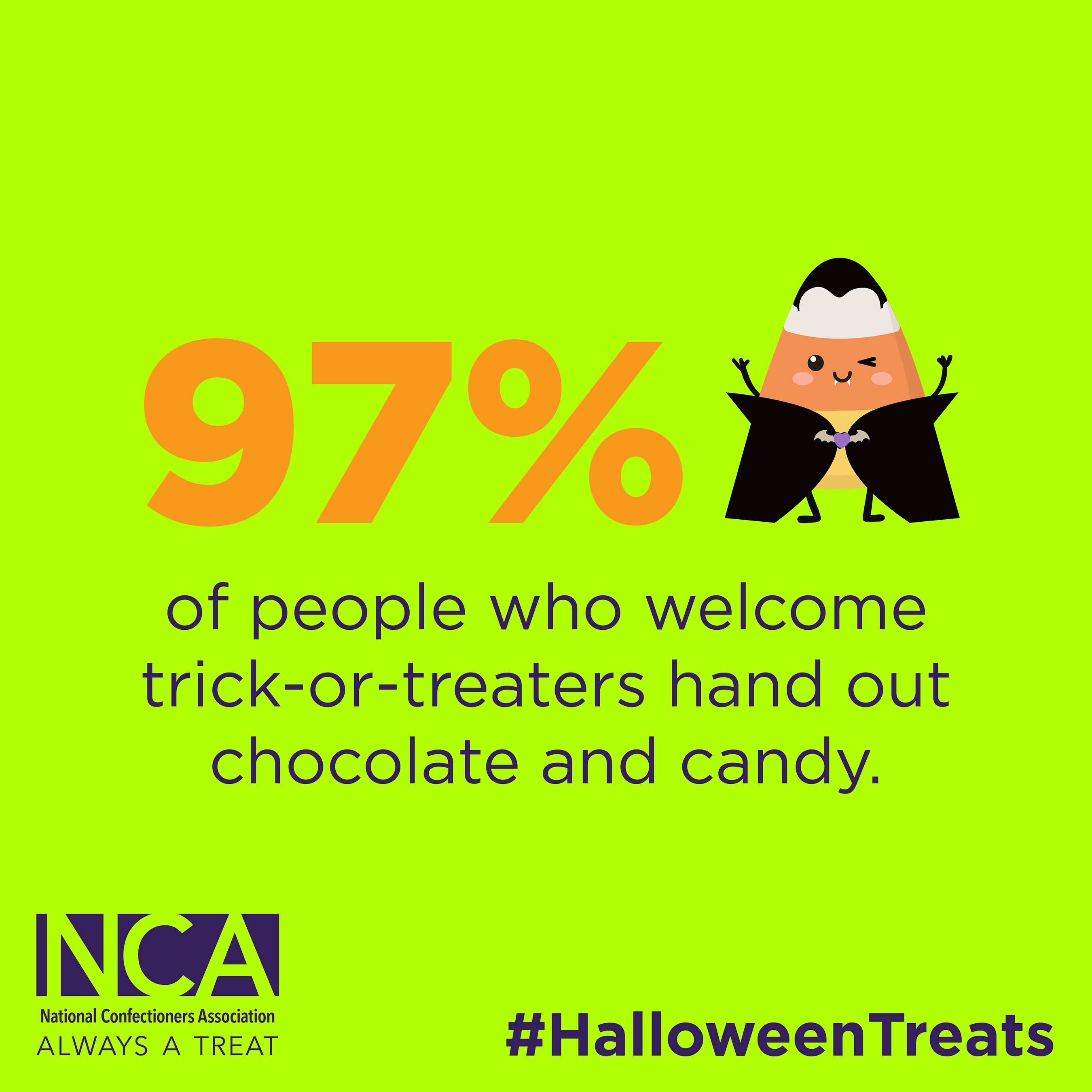 This Halloween season is even sweeter because America’s chocolate and candy companies delivered on their commitment to help consumers manage their sugar intake by providing more transparency, choice and portion guidance options. 85% of chocolate and candy sold today comes in packaging that contains 200 calories or less per pack. That number includes individually wrapped products or multipacks that contain smaller packages inside – the perfect size for the 97% of Americans who say they welcome trick-or-treaters with chocolate and candy.