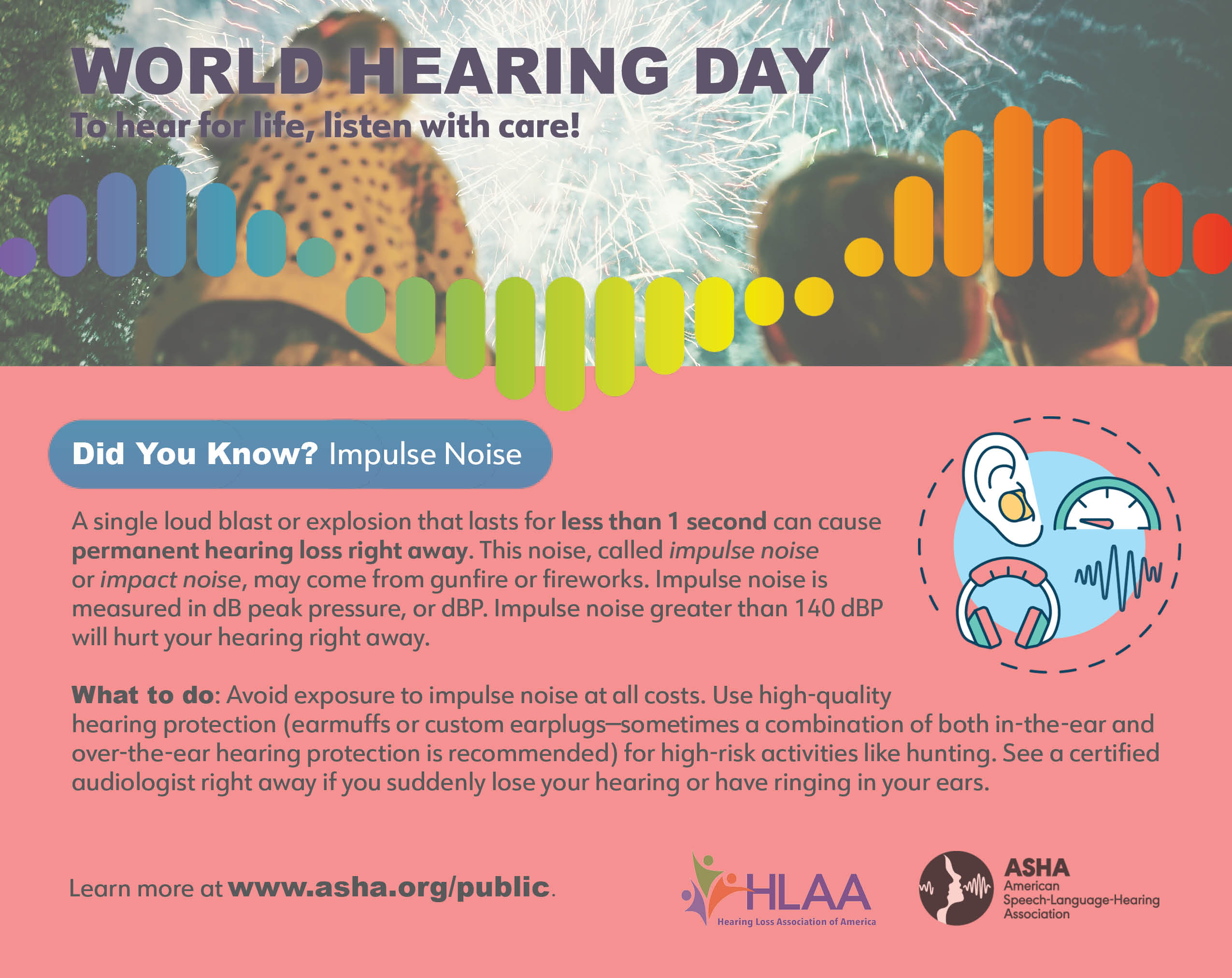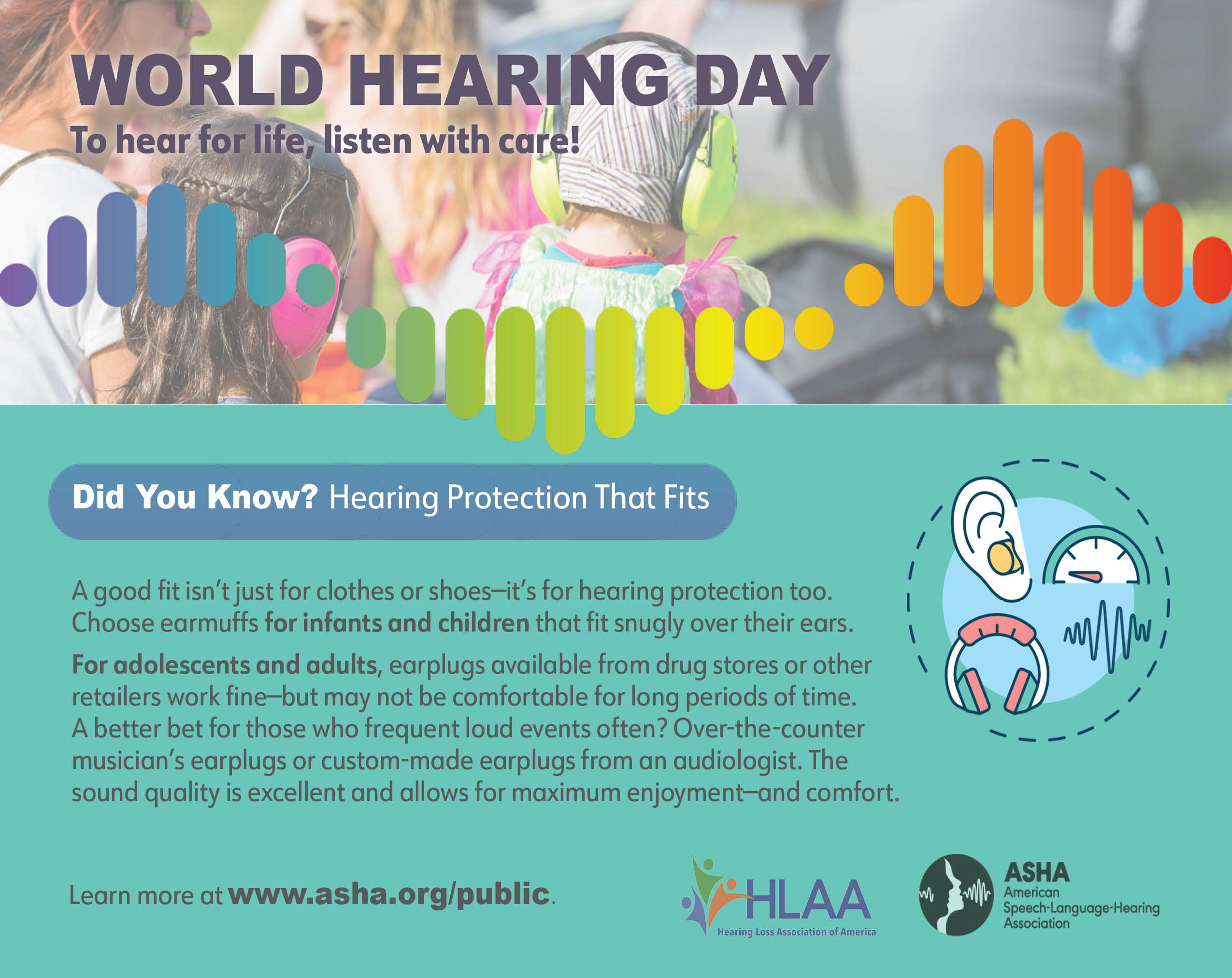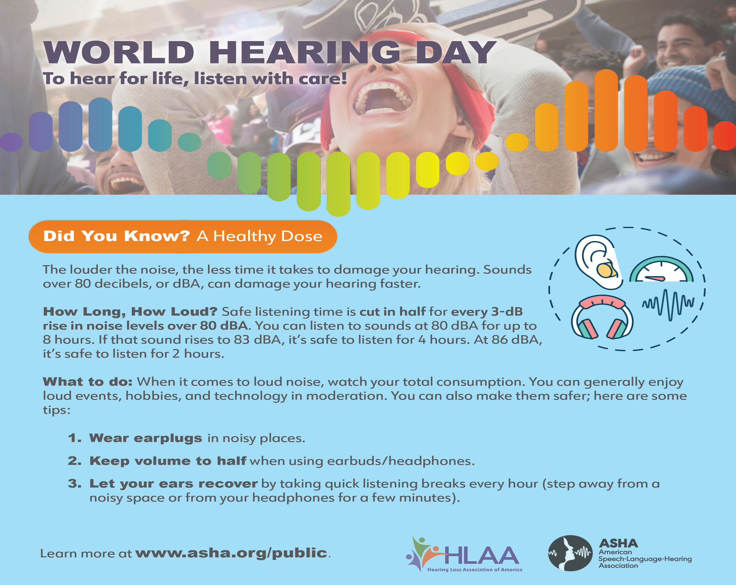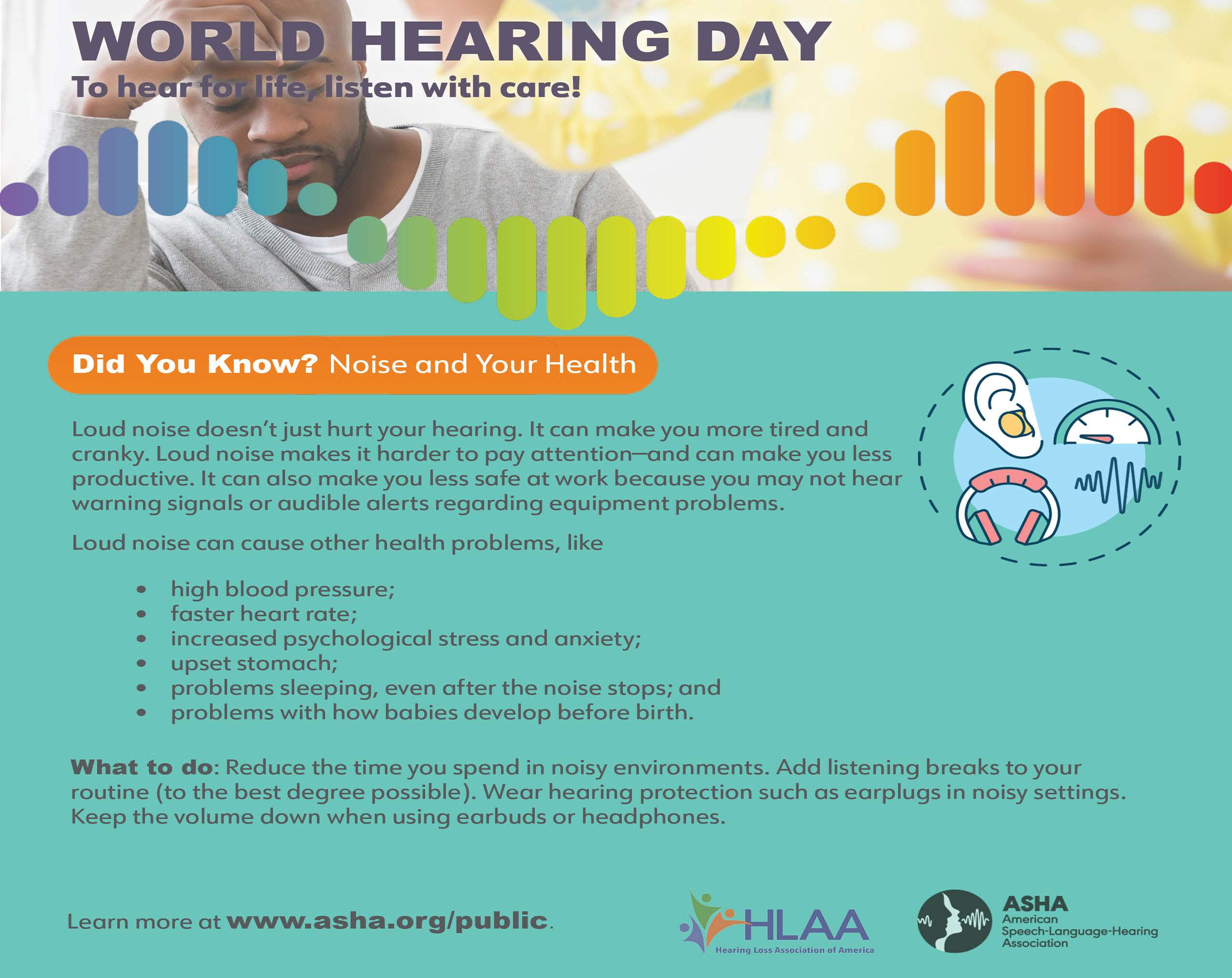 Domestically, ASHA and HLAA are spotlighting the WHO’s global standard as well as collaborating on a toolkit for its memberships with a series of educational graphics intended for the public. These tools promote how individuals can protect their hearing, and that of their loved ones, across the lifespan. Educational pieces inform on noisy events, in alignment with WHO’s theme and standard, as well as on other everyday hazards to hearing.
