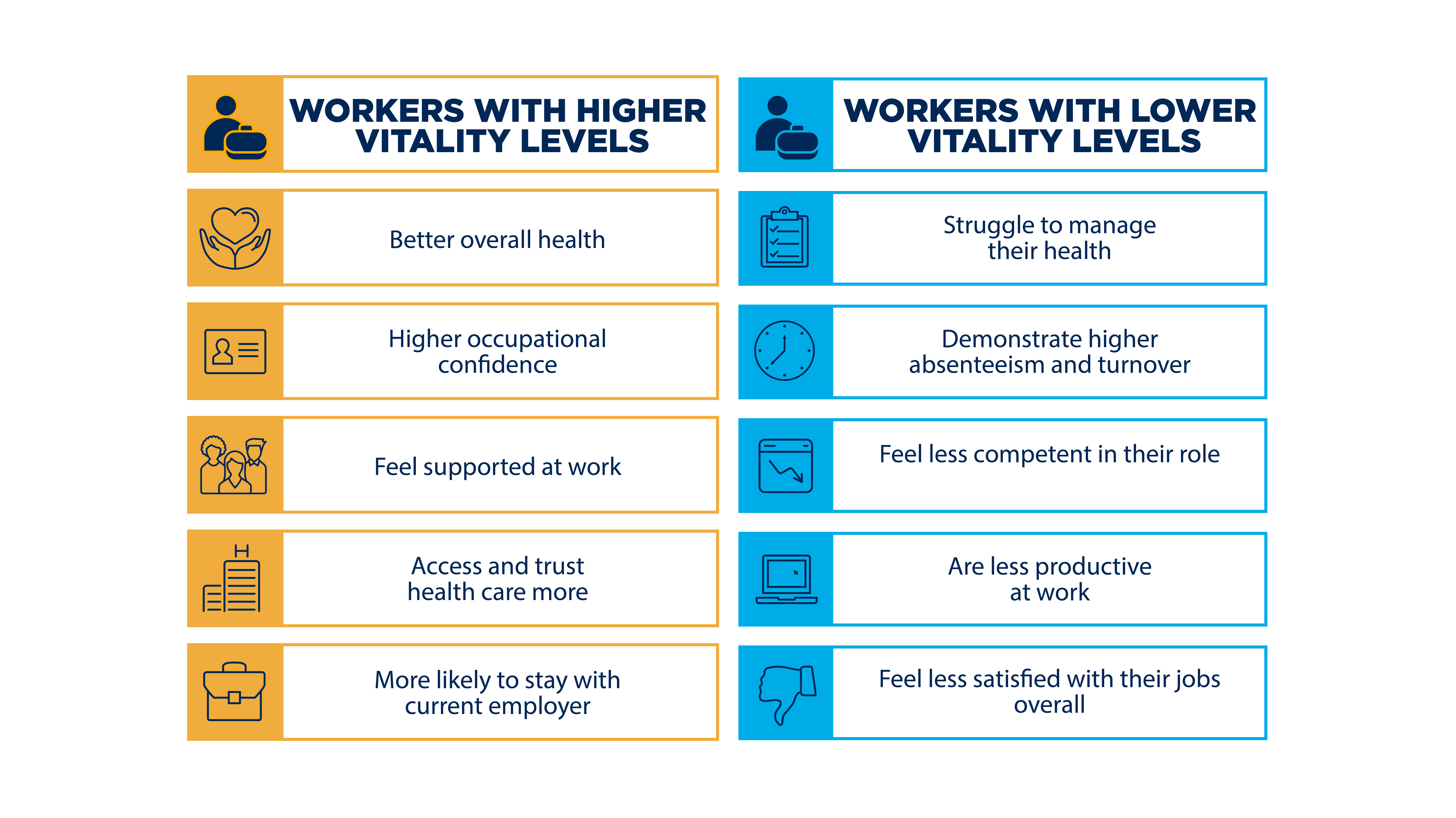 Higher vitality is linked to a more motivated, productive workforce, while low vitality contributes to poor work quality, higher turnover and workplace dissatisfaction. By better understanding vitality and the factors that impact it, employers can help fuel a healthier workforce, and drive business and economic growth.