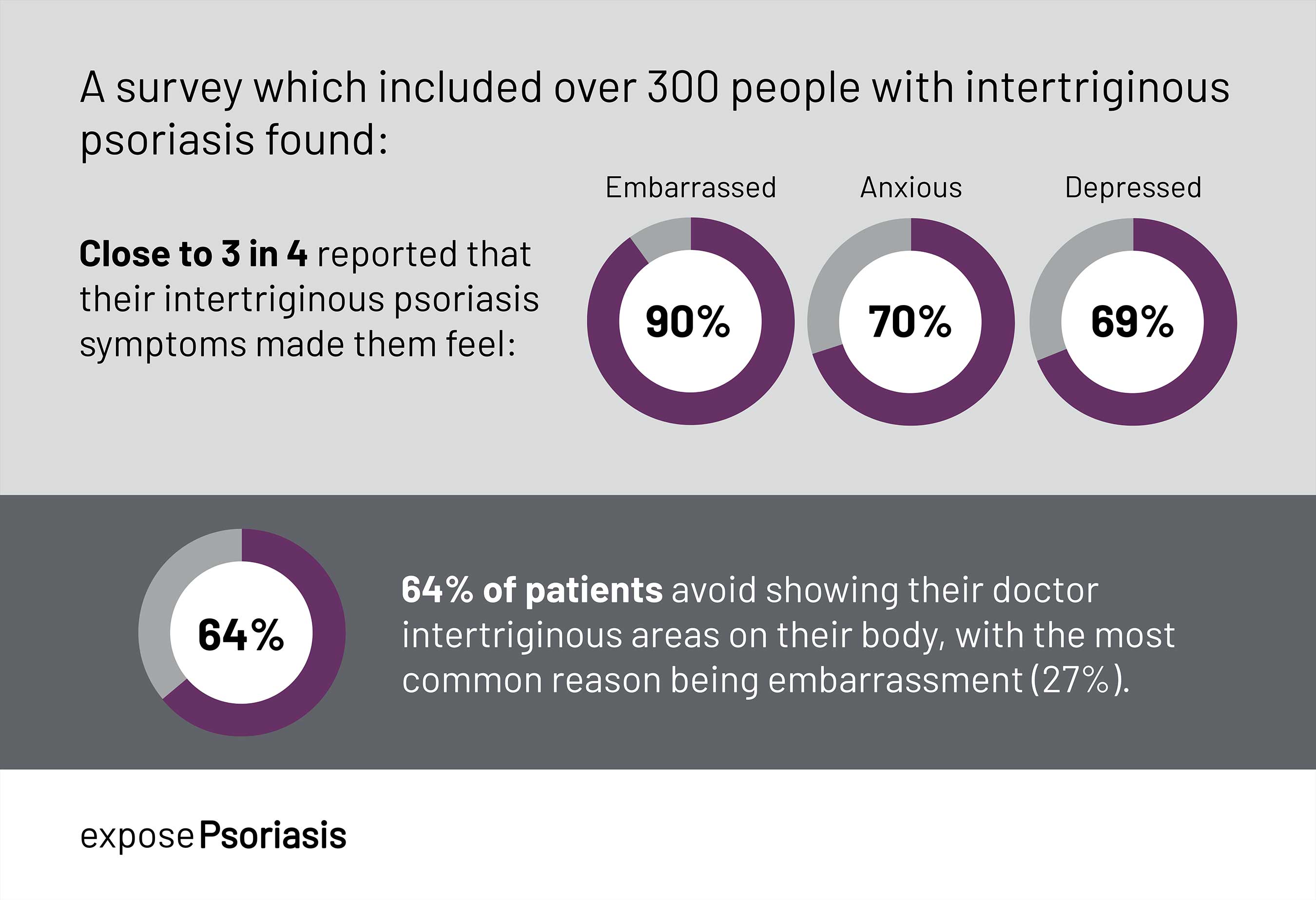 Expose Psoriasis illuminates how plaque psoriasis may significantly impact many aspects of daily life, including day-to-day decisions such as what to wear, participation in social activities, and interpersonal relationships. The campaign also aims to raise awareness that symptoms may occur anywhere on the body, including knees, elbows, torso, and sensitive places like the face, genitals, and areas of skin-to-skin contact (intertriginous areas), such as armpits, under the breasts, stomach folds, between the buttocks, and in the groin area.