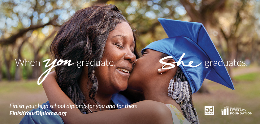 NEW YORK – May 18, 2022 –The Dollar General Literacy Foundation (DGLF) and the Ad Council are releasing new public service announcements (PSAs) today to reach adults without a high school diploma. As part of their longstanding Finish Your Diploma campaign, the new “When You Graduate, They Graduate” campaign shows that along with increased job opportunities and higher earnings, parental literacy and high school completion can have a positive ripple effect on the family. The campaign was developed pro bono by creative advertising agency BBH USA.
