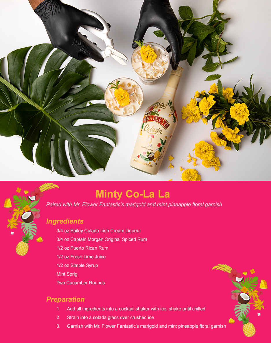 “Baileys Colada was my go-to summer indulgence last year thanks to the delicious pineapple and coconut flavors that made it easier than ever to catch all the vacation vibes,” says La La Anthony. “This year, I’m tapping into my Puerto Rican roots to create some new go-to Baileys Colada cocktails with help from my friend Mr. Flower Fantastic, that will definitely brighten up any summer day!”