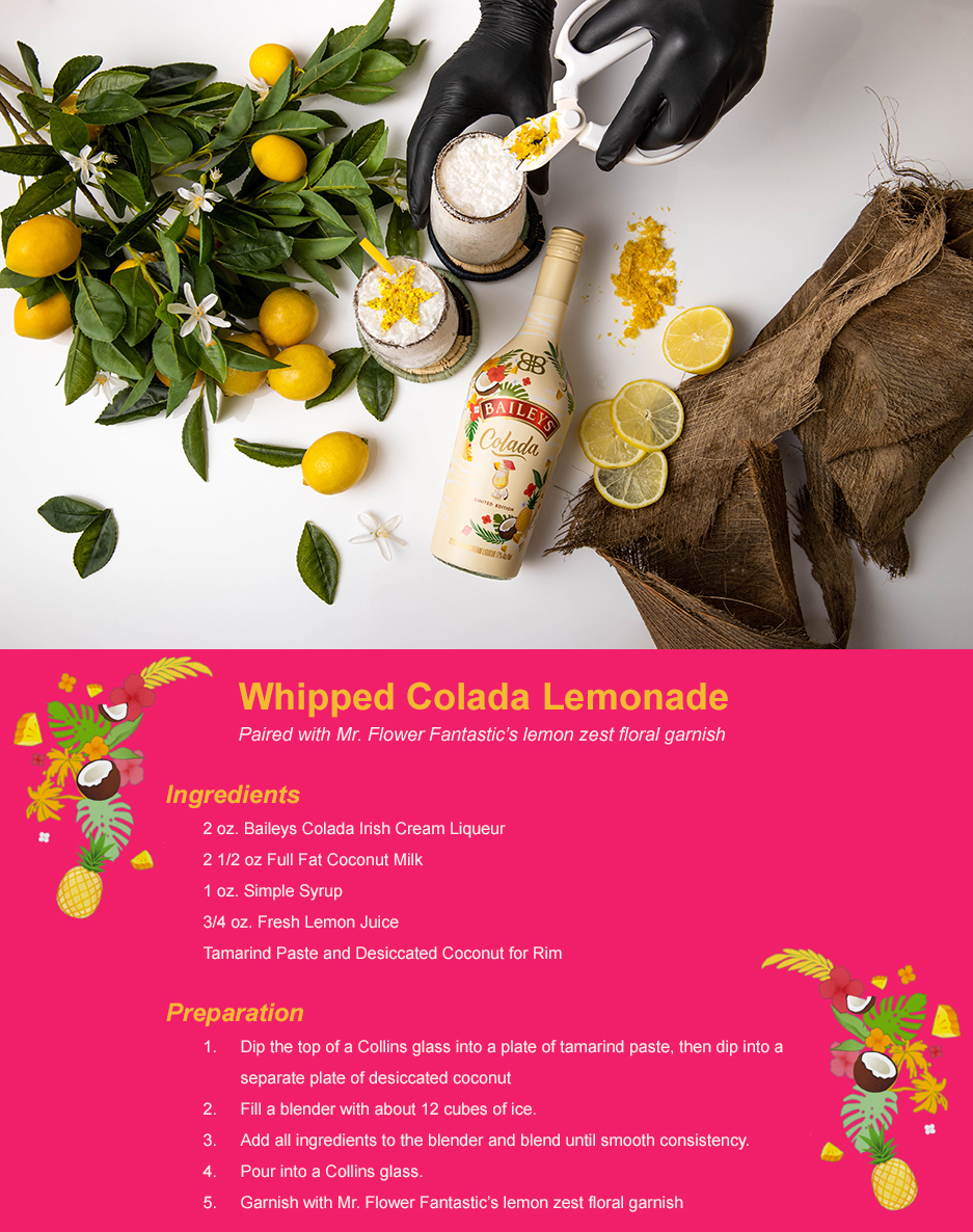 Mr. Flower Fantastic pairs the Whipped Colada Lemonade with a lemon zest floral garnish