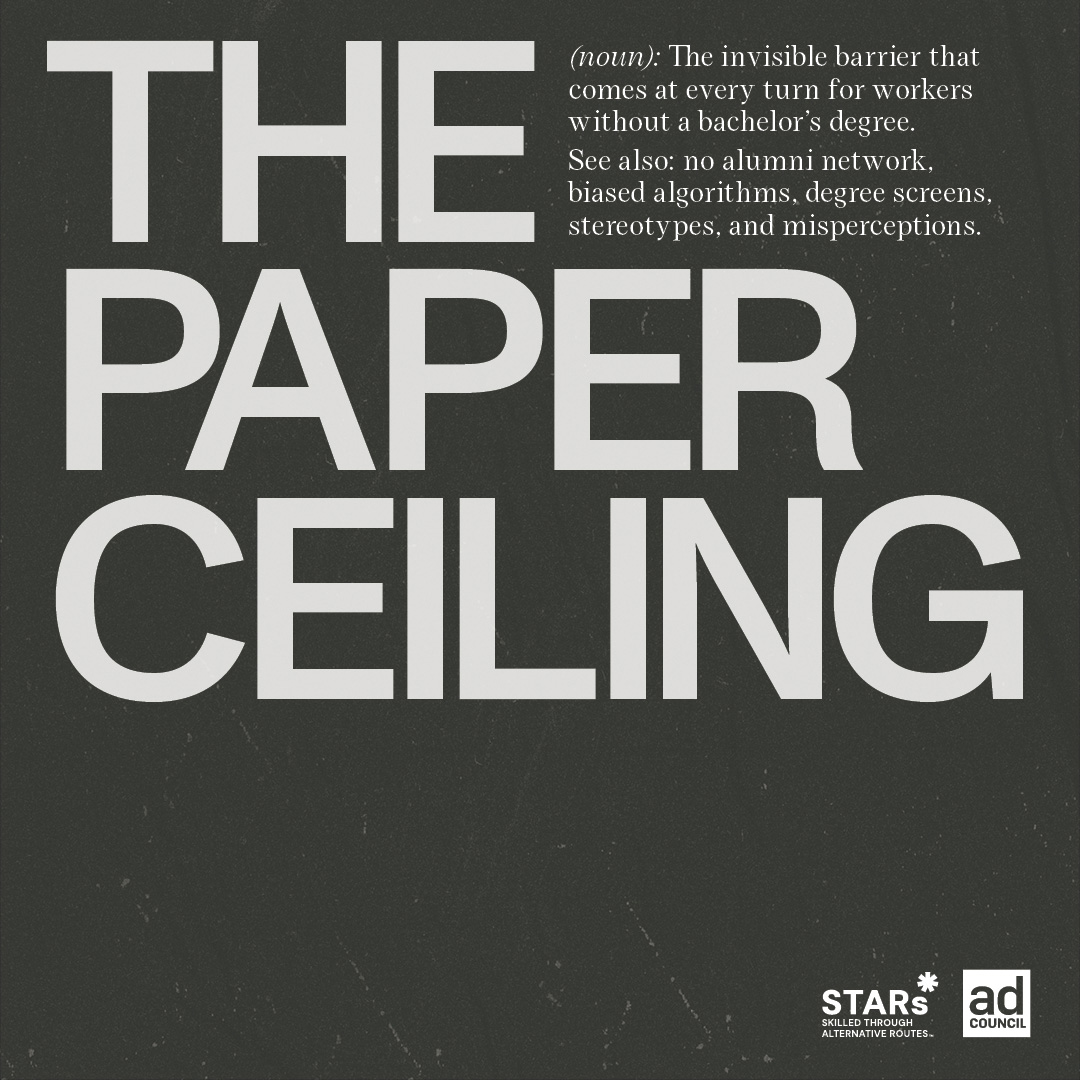 The multiyear campaign aims to change the narrative around the value and potential of workers who are Skilled Through Alternative Routes (STARs), rather than through a bachelor's degree. There are more than 70 million STARs in the U.S. who have developed valuable skills through community college, workforce training, bootcamps, certificate programs, military service or on-the-job learning. Currently, the lack of alumni networks, biased algorithms, degree screens, false stereotypes and misperceptions contribute to the paper ceiling, which creates barriers to upward economic mobility for STARs.