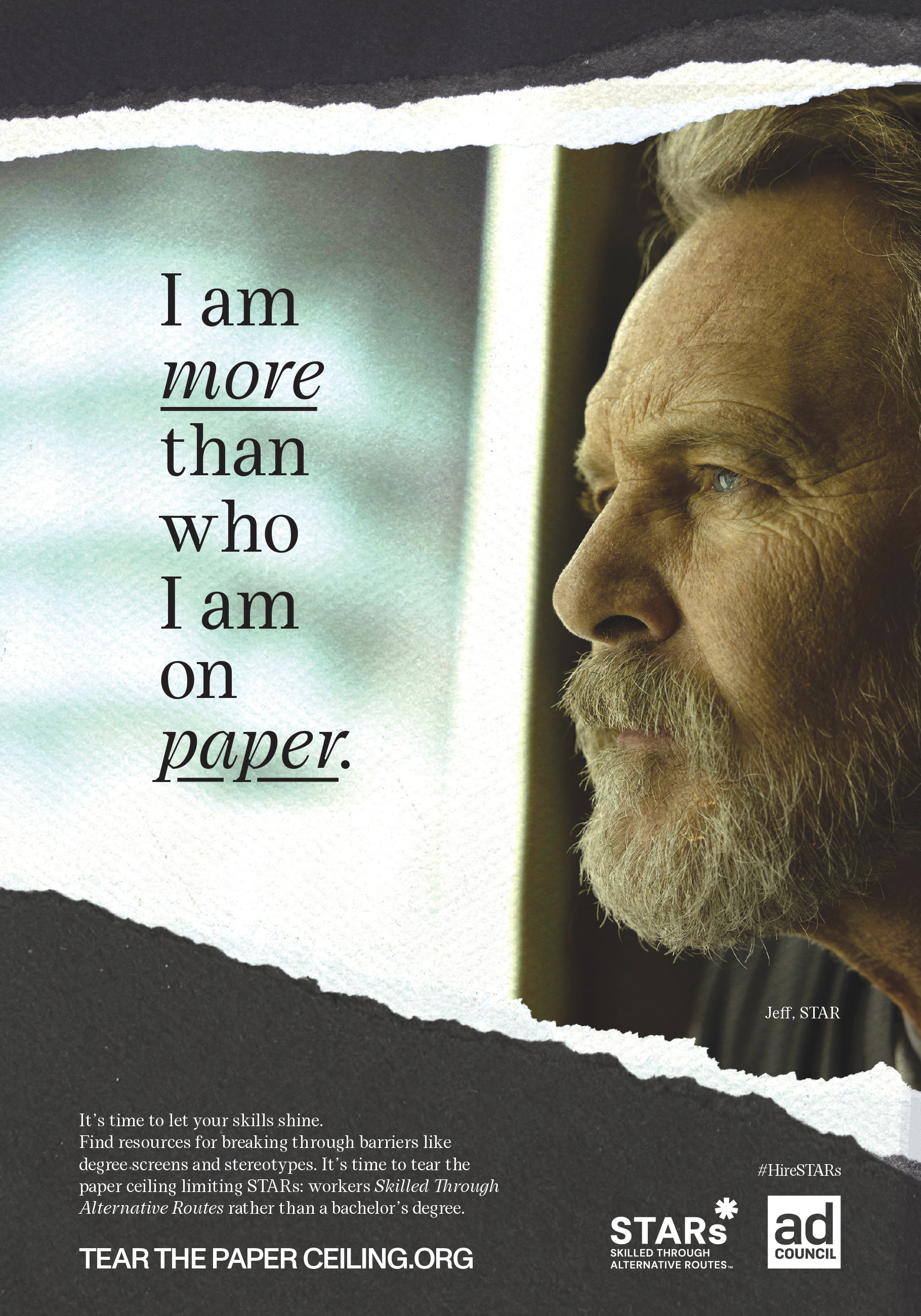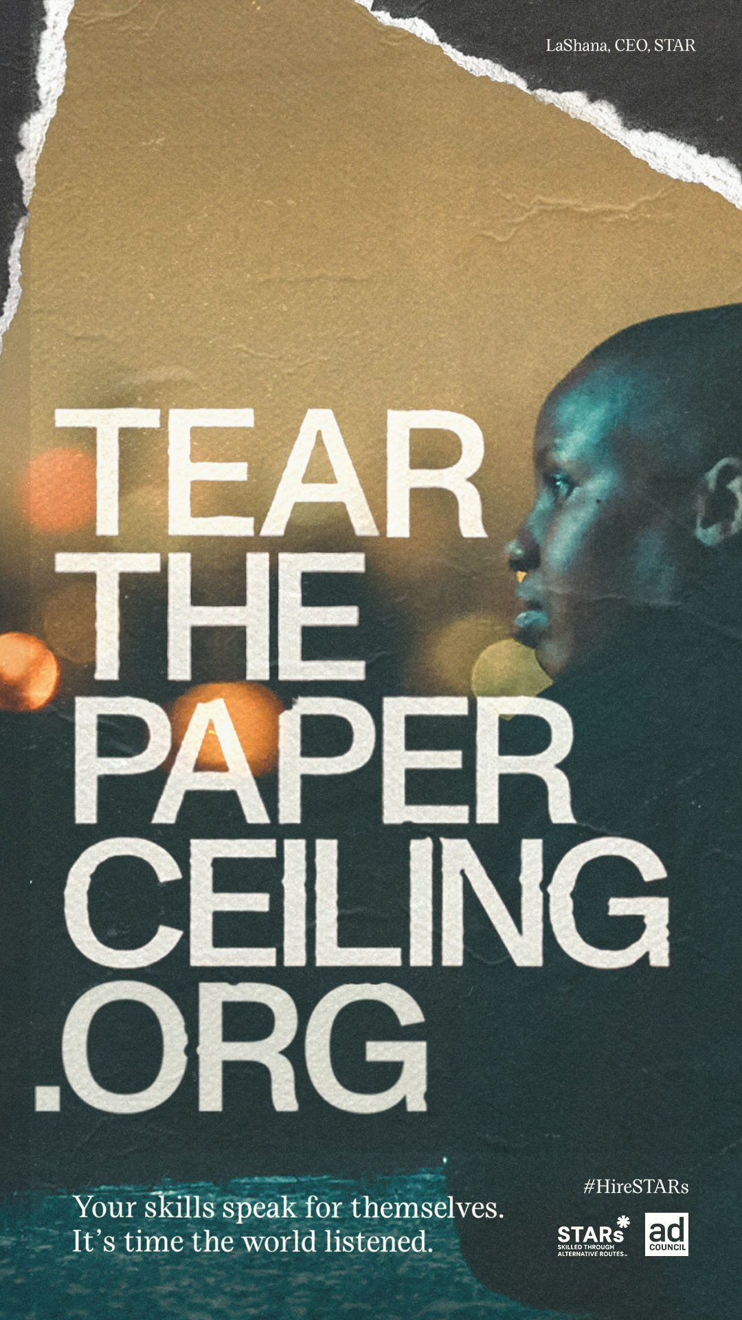 “Across America today, millions of workers are unfairly shut out from job opportunities because of misperceptions about their skills and preparedness,” said Ad Council President and CEO Lisa Sherman. “Through the Tear the Paper Ceiling campaign, we will change the narrative to celebrate and affirm the skills that STARs can bring to the workforce. Together with our powerful coalition of partners, our efforts will help more STARs access equitable job opportunities and inspire employers to discover untapped talent.”