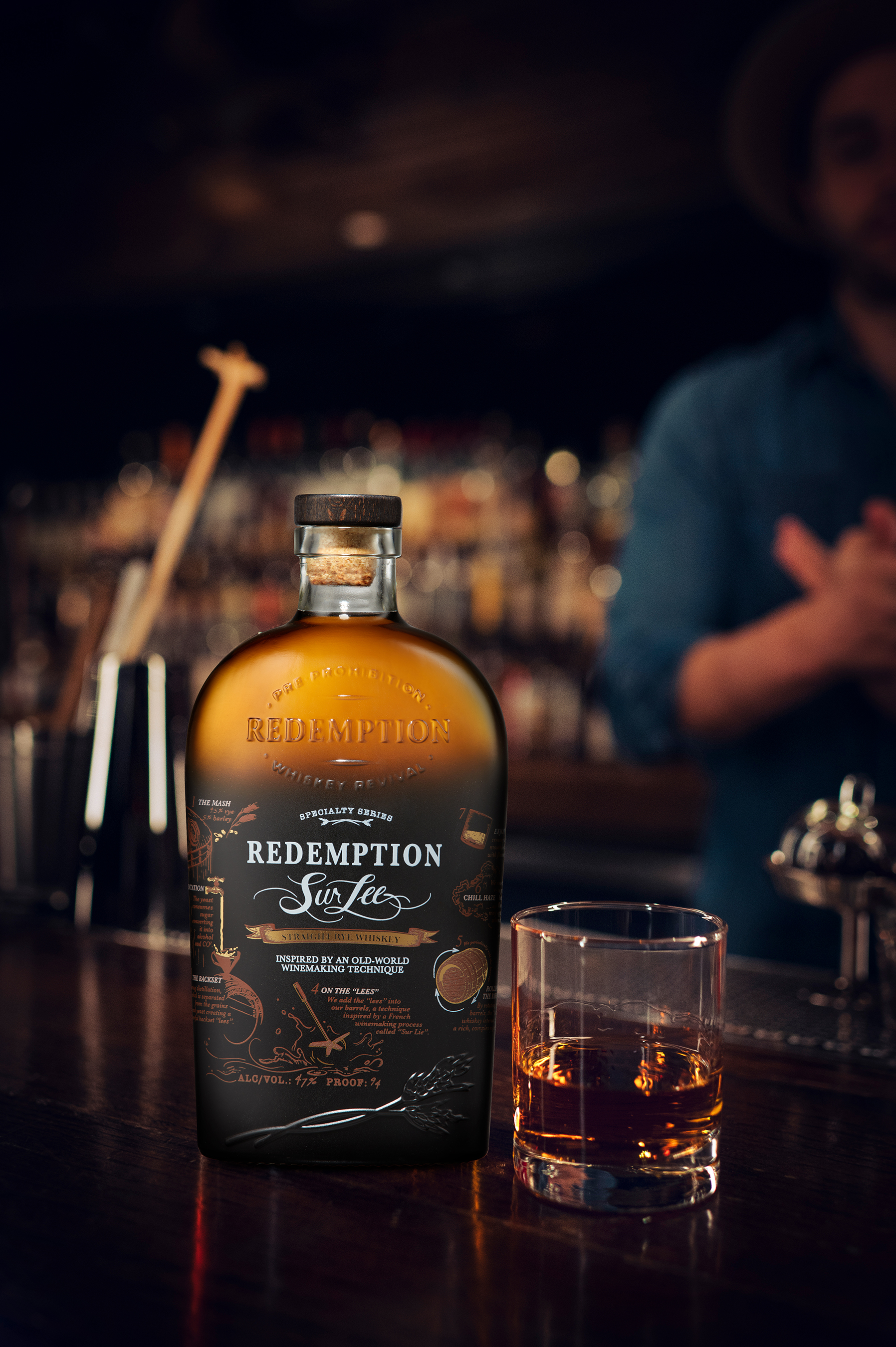 Redemption Sur Lee is best enjoyed neat or on the rocks. The striking bottle design, featuring a silkscreen label and metallic accents, artistically explains Sur Lee’s ground-breaking process, beautifully showcasing how the old-world winemaking process was applied to transform the whiskey.