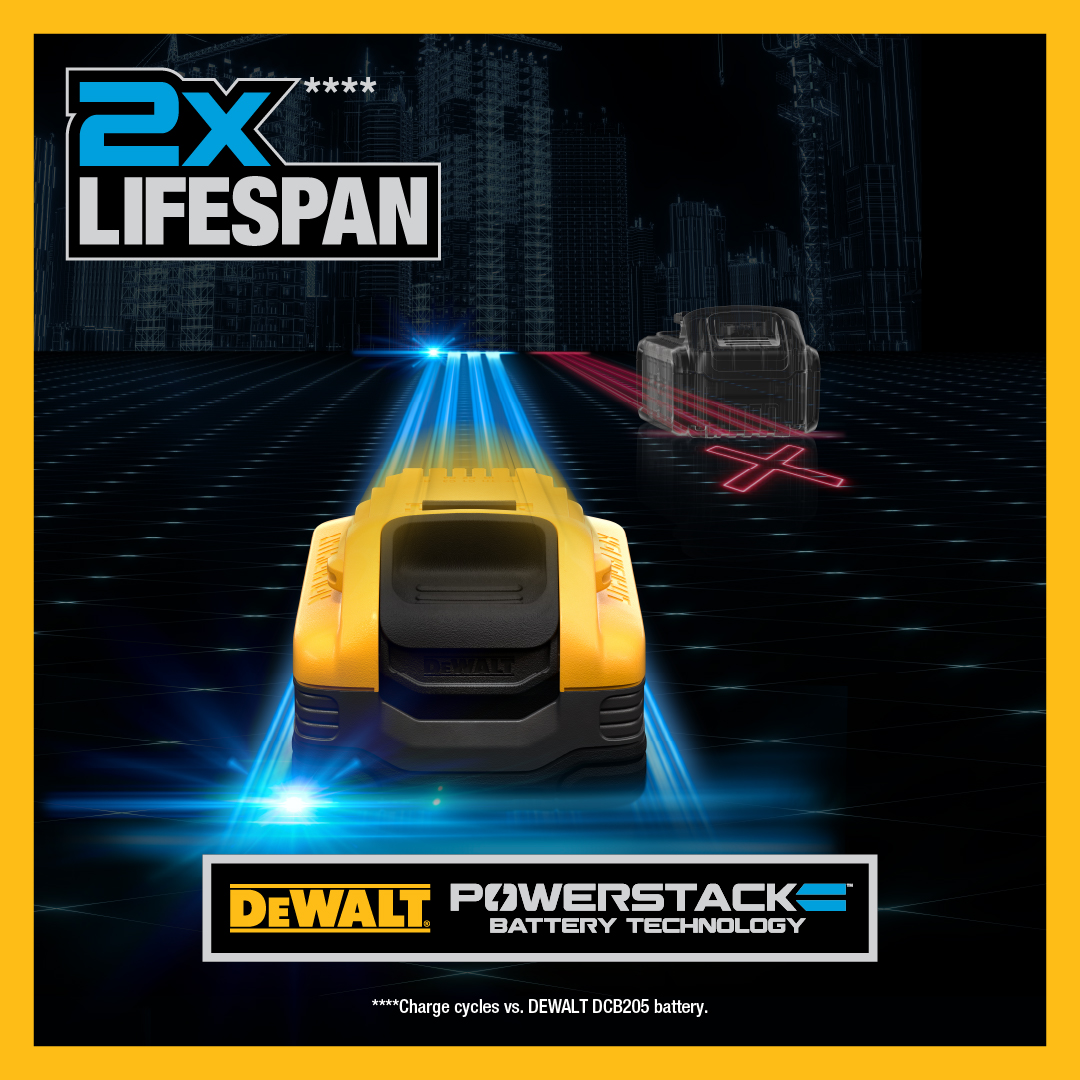 DEWALT has been at the forefront of trailblazing technology since 1924, producing many industry-first products that get the job done. DEWALT’s legacy of innovation continues with the introduction of the DEWALT POWERSTACK™ 20V MAX* 5Ah Battery, THE NEXT DIMENSION IN POWER™.