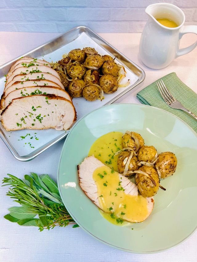 A great example is the Sheet Pan Roasted Turkey and Herbed Potatoes dish. One pan gets you a complete meal, and by throwing in some extra potatoes, you can get a jump start on your cooking for the next few days! And you can do this with multiple combinations of proteins, potatoes and other vegetables you like.