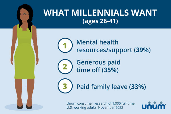 The top 3 non-insurance benefits Millennials want: Mental health resources/support, generous paid time off, and paid family leave.