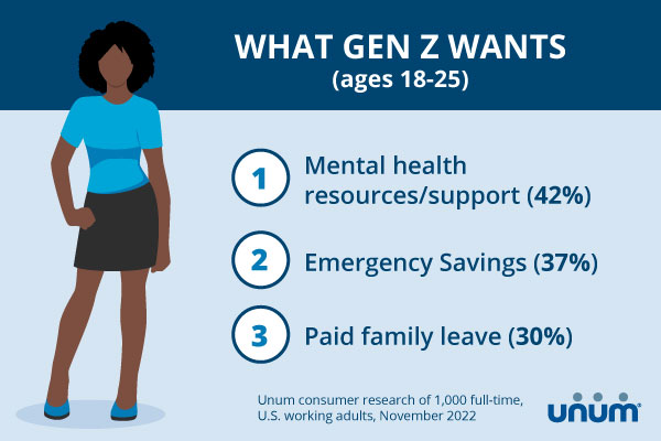 The top 3 non-insurance benefits Gen Z wants: Mental health resources/support, emergency savings, and paid family leave.