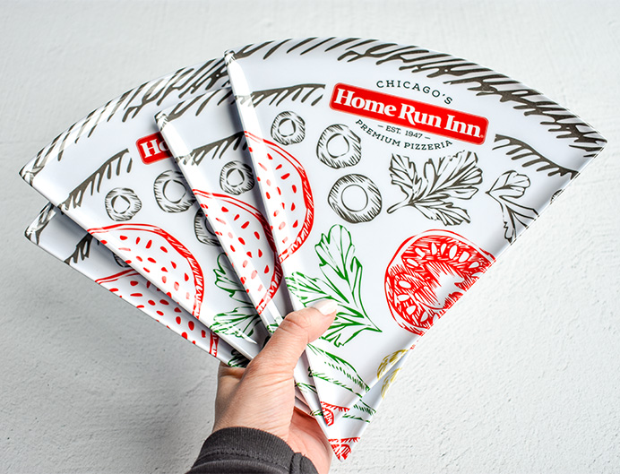 Our pizza plates are the perfect size for a slice of your HRI pizza. A kid favorite in every household.