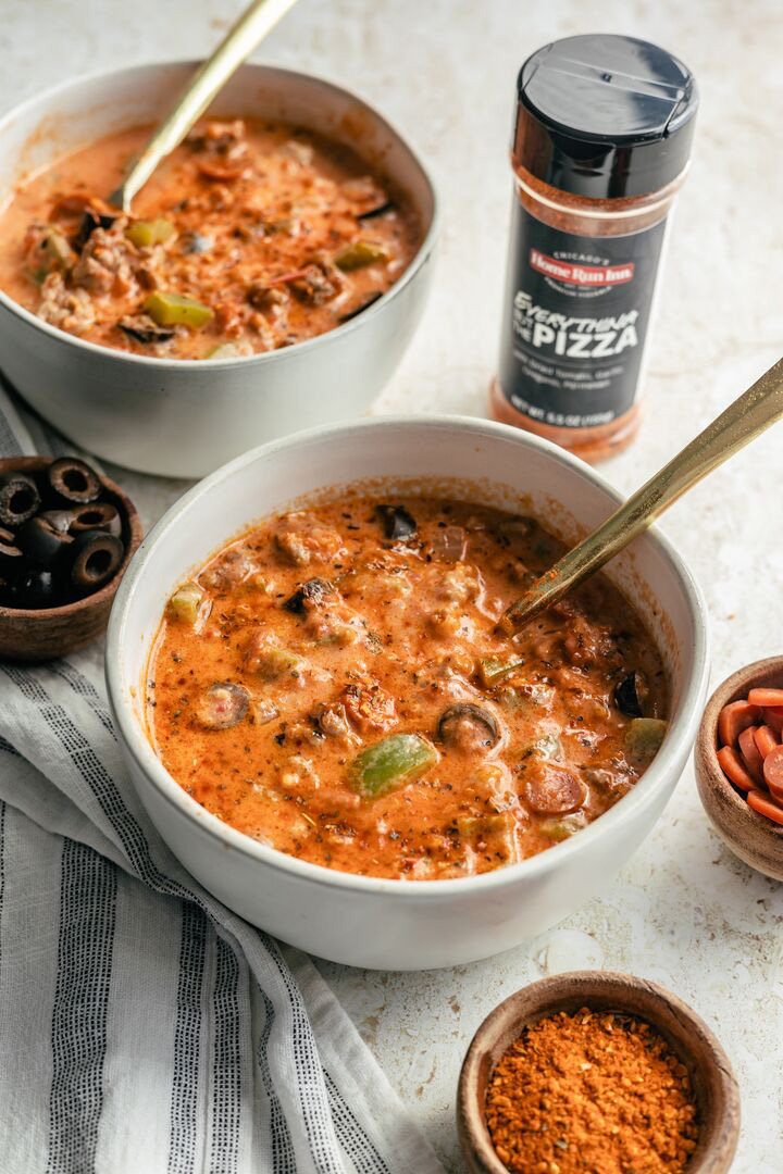 Transform your pizza soup into a flavor-packed delight by adding Home Run Inn Pizza Spice, infusing every spoonful with the irresistible taste of a classic pizzeria. A warm, comforting soup with a delicious twist.