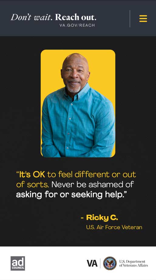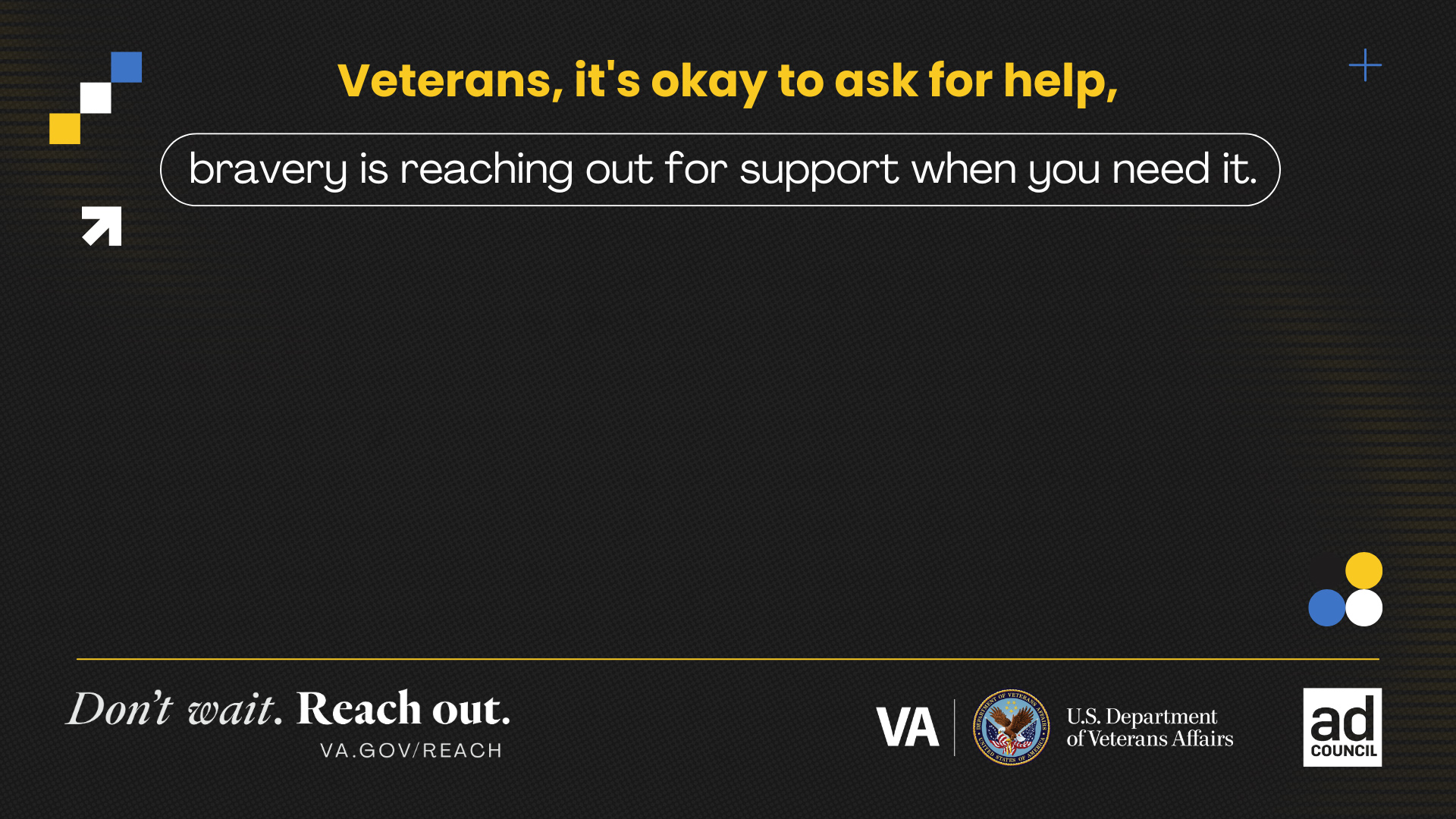 The “Don’t Wait. Reach Out.” campaign is part of VA’s 10-year strategy to end Veteran suicide through a comprehensive, public health approach, combining community prevention and clinical intervention strategies. The campaign is also part of the Ad Council’s Mental Health Initiative, a multi-year effort to change social norms and create a society that is more open, accepting and proactive when it comes to mental health.