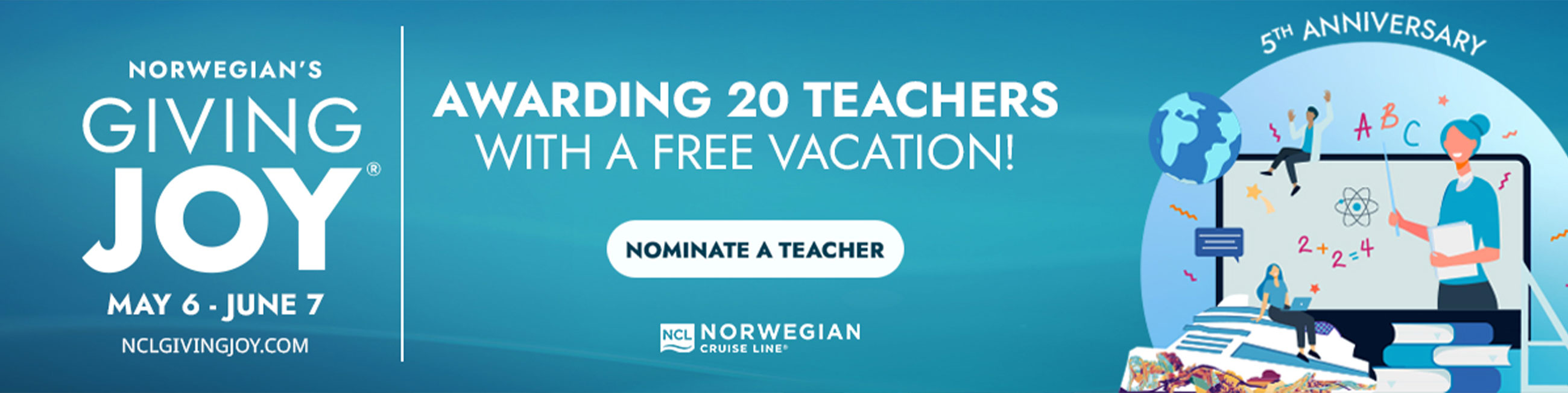 @CruiseNorwegian celebrates educators by revealing a year-round teacher cruise discount along with its 5th annual Giving Joy contest, awarding outstanding teachers with a chance to sail aboard the new #NorwegianAqua. Nominate and vote today at www.nclgivingjoy.com. #NCLGivingJoy Tweet
