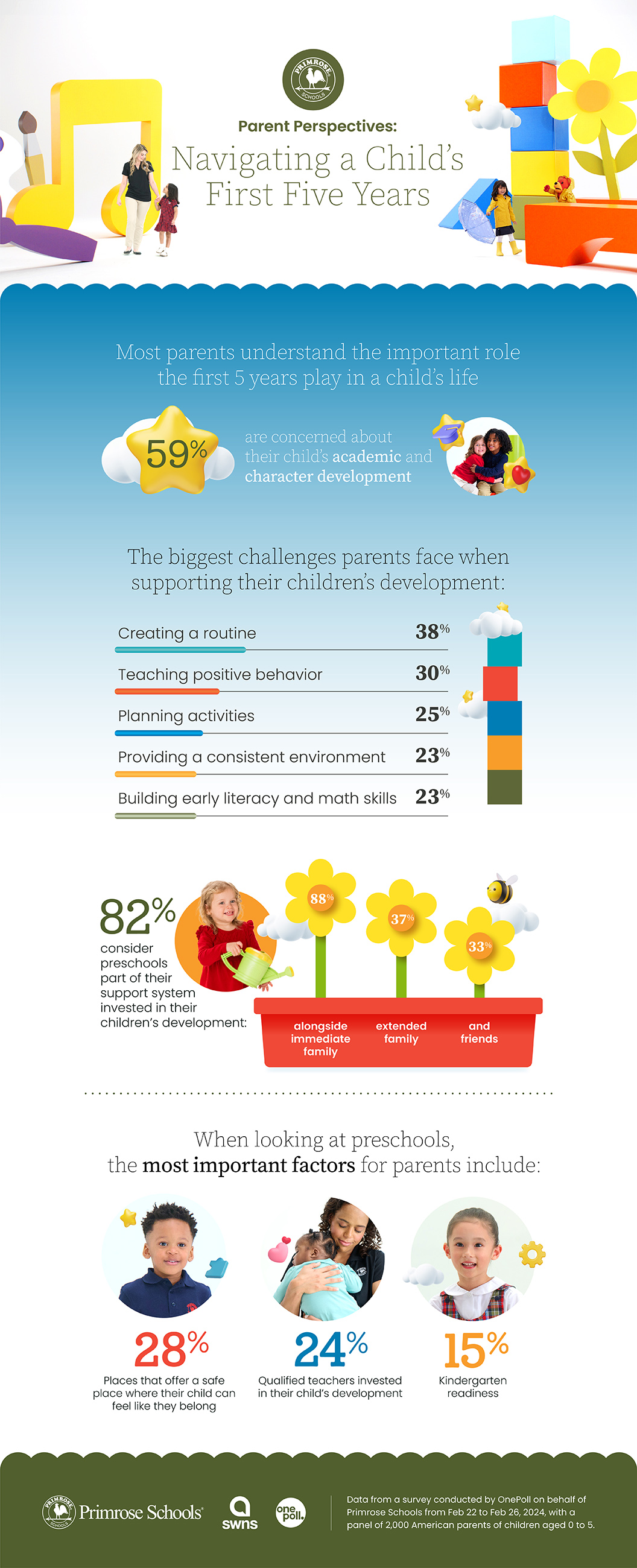 Commissioned by Primrose Schools® and conducted by OnePoll, the study revealed a large majority (98%) of parents understand the importance the first five years of life play in a child’s development and future successes.