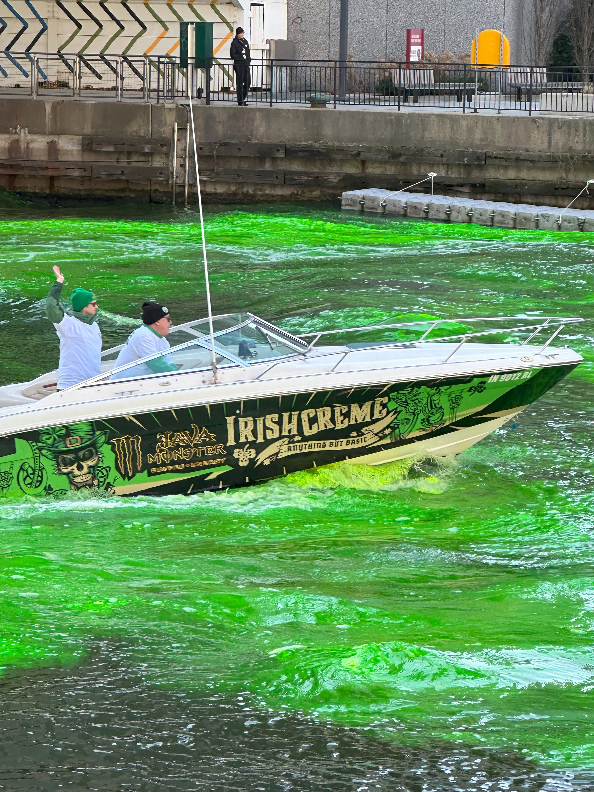 The Chicago River gleamed a brilliant emerald with a little help from Monster Energy in the annual river-dyeing tradition.