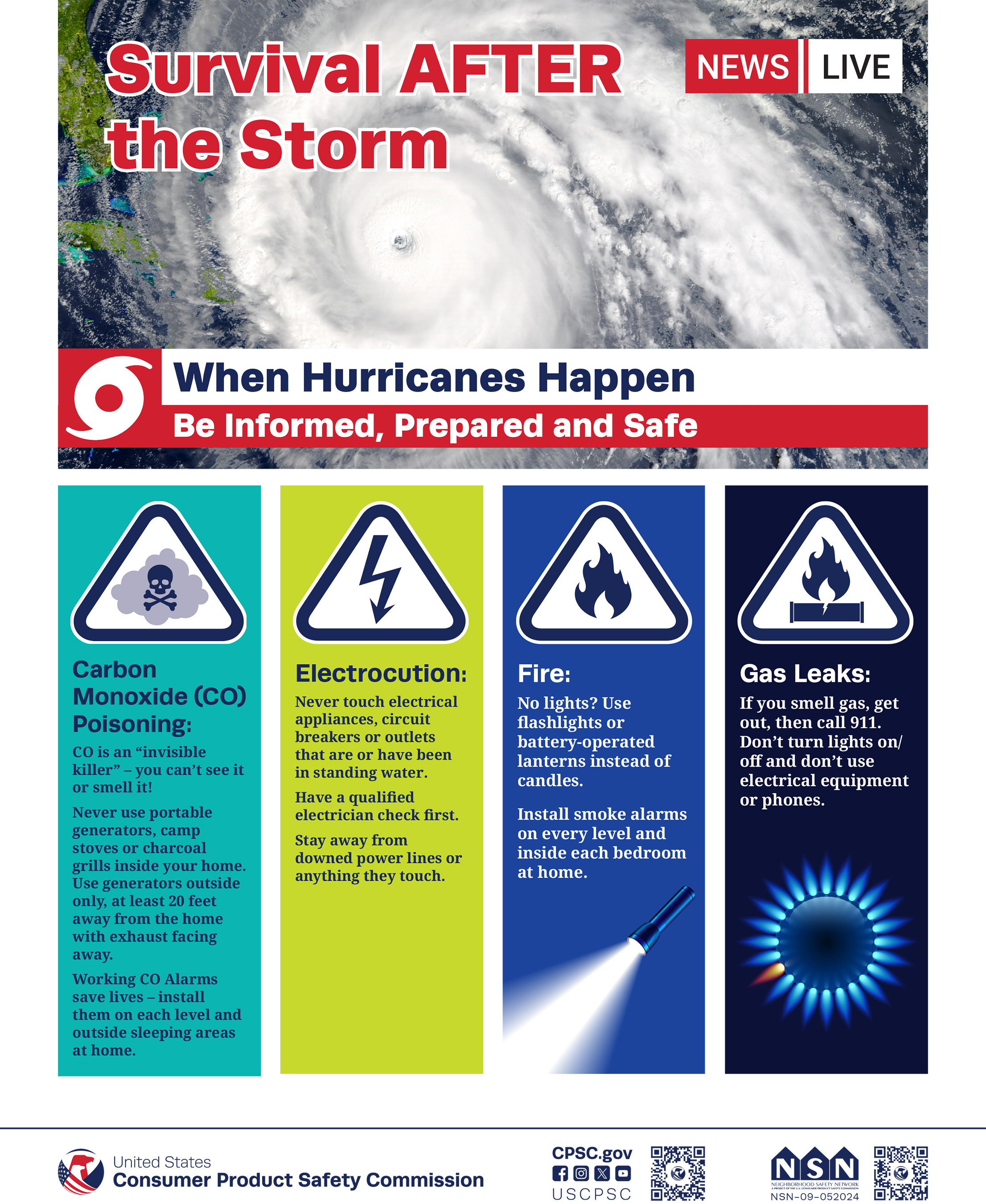 WASHINGTON, D.C. – June 1 marks the start of the 2024 Atlantic hurricane season, and it could be an extremely active one, according to some forecasts of 2024 hurricane activity. The U.S. Consumer Product Safety Commission (CPSC) is warning consumers about the increased risk of carbon monoxide (CO) poisoning, fires and electric shock after hurricanes and severe storms hit.