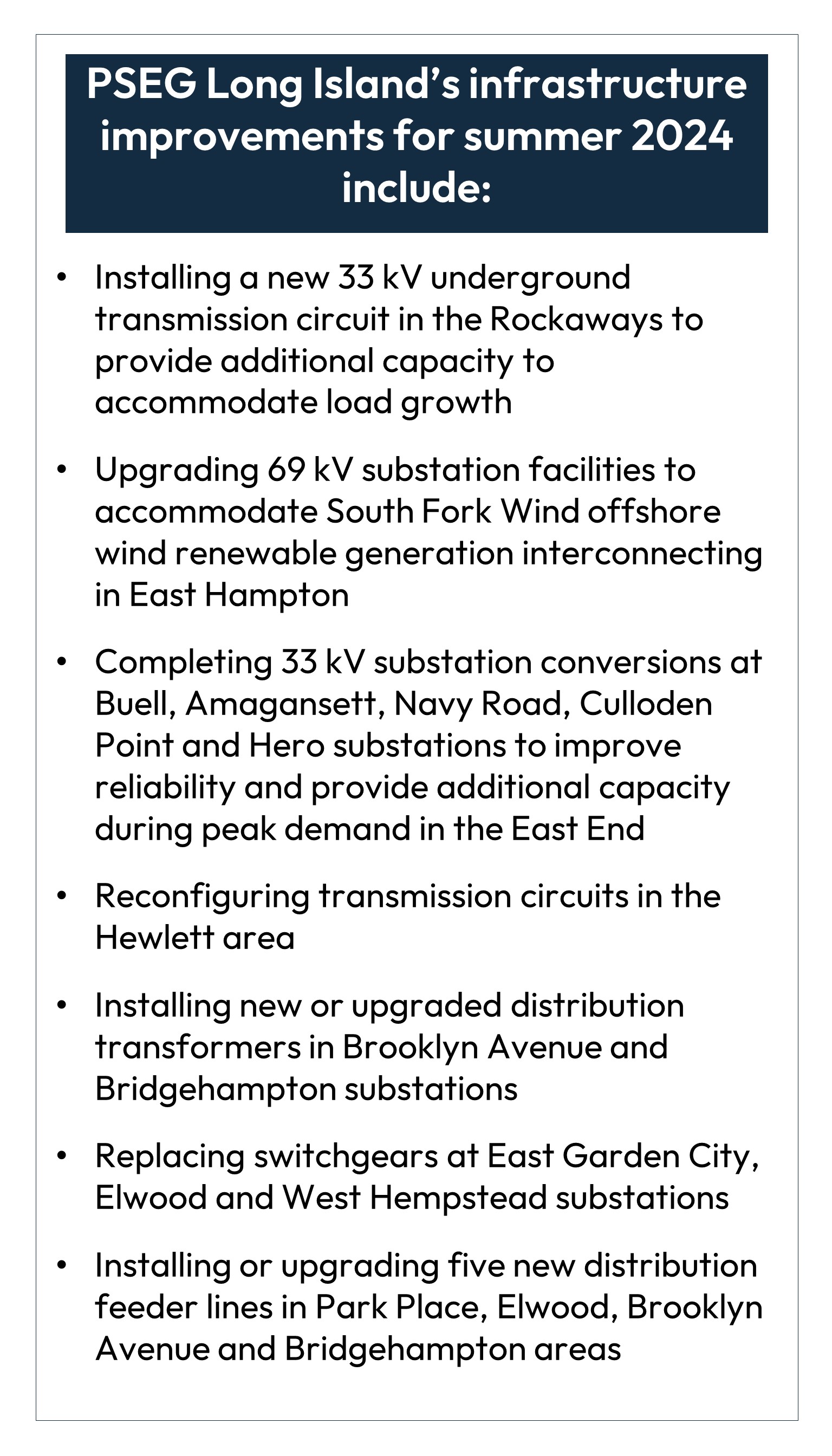 “Providing reliable electric service to approximately 1.2 million customers is a long-term commitment, and our personnel work year-round to ensure the grid is ready for summer’s extreme weather conditions,” said Michael Sullivan, vice president of Electric Operations, PSEG Long Island. “The improvements we have made over the past decade continue to help us deliver consistent, resilient power to our customers, today and in the future.”