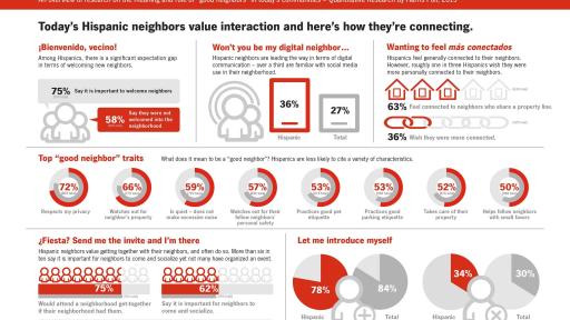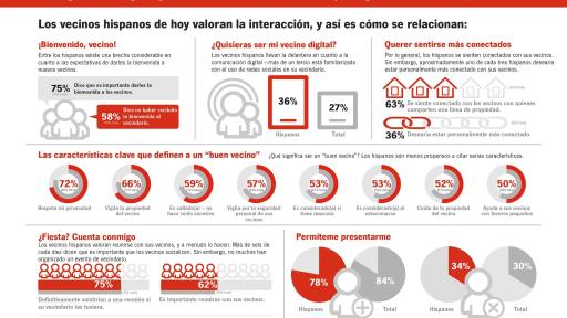 “Los hispanos son líderes en cuanto a la comunicación en línea con sus vecinos. Las interacciones virtuales –como el uso de las redes sociales para organizar un evento o ponerse al corriente con un vecino– se están volviendo tan importantes como las interacciones cara a cara”, dijo Minski. “Es importante que todos comprendan el rol que puede jugar la tecnología para cultivar relaciones significativas y unir a los vecinos”.