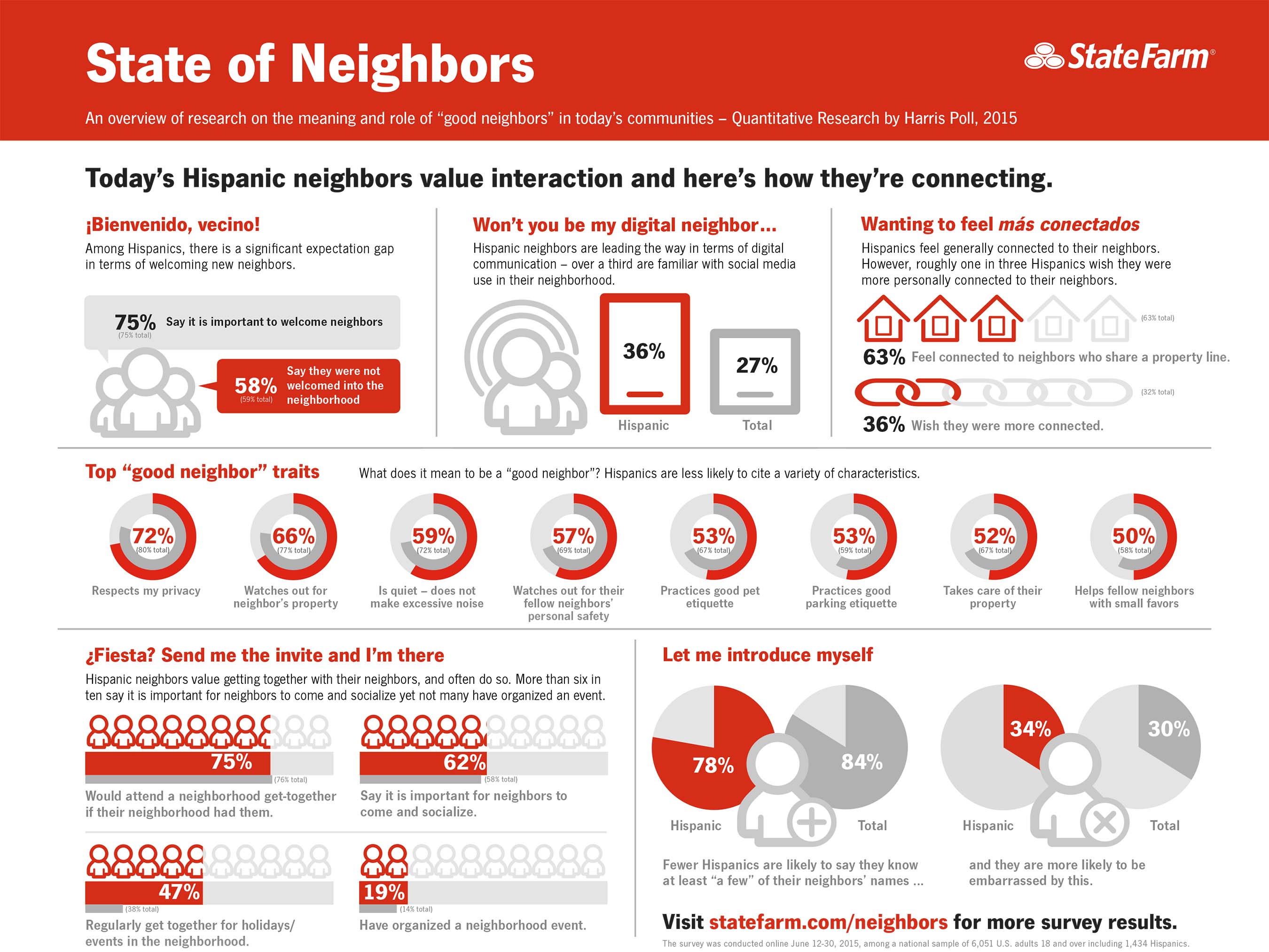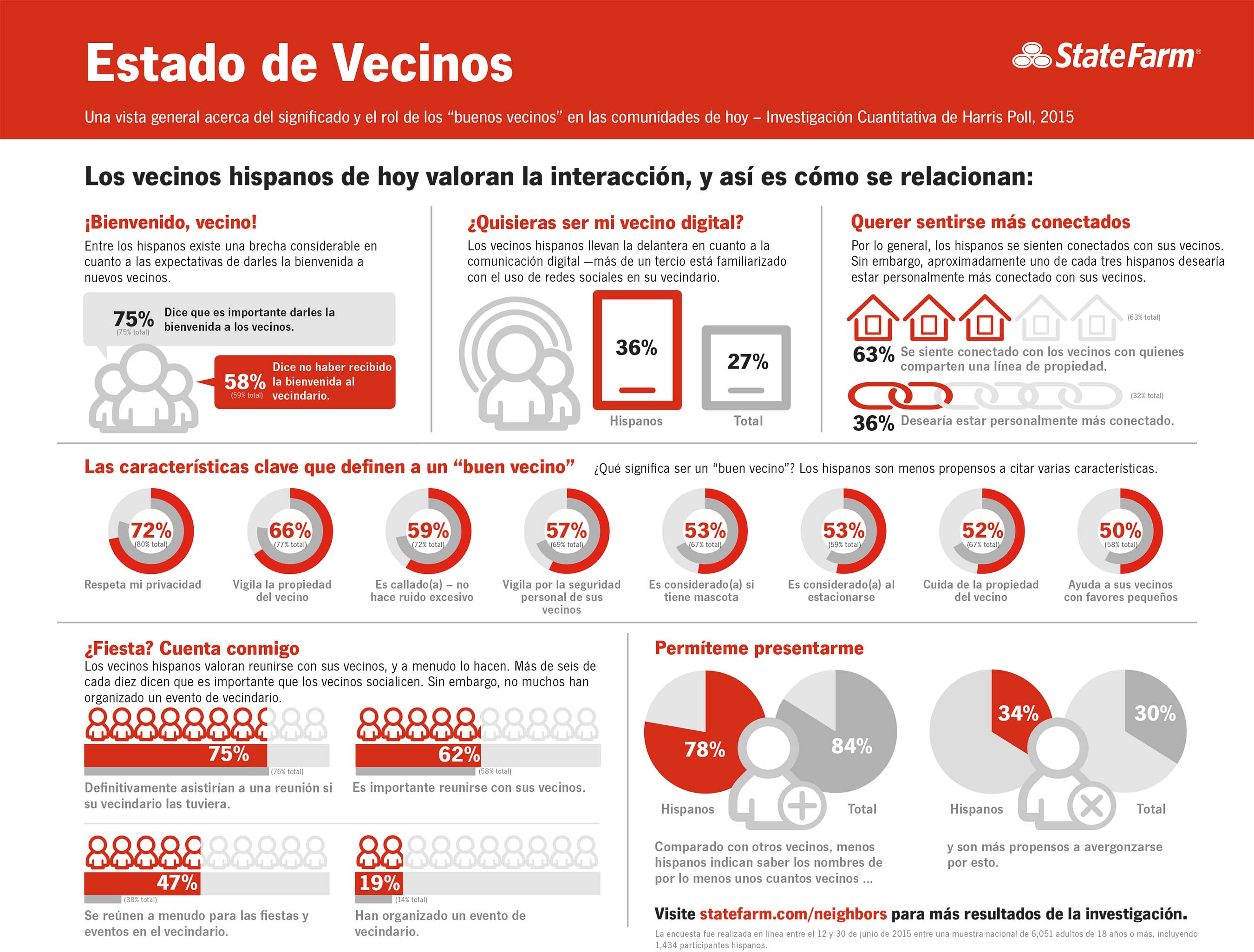 Para comprender lo que realmente está sucediendo en el vecindario, State Farm comisionó a Harris Poll para llevar a cabo una investigación con el objetivo de examinar cómo las personas en Estados Unidos ven las relaciones vecinales. La encuesta se llevó a cabo en línea entre una muestra nacional de 6,051 adultos estadounidenses de 18 años o más incluyendo 1,434 participantes hispanos. Los resultados incluyen áreas específicas donde las actitudes y las acciones no muestran resultados consistentes. Sin embargo, con medidas sencillas, éstas son brechas que se pueden cerrar.