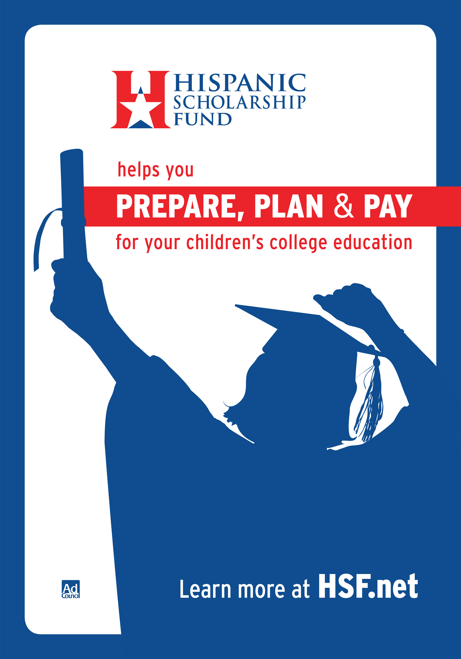 Los nuevos anuncios de servicio público, que protagonizan los actores Adam Rodríguez y Edward James Olmos y los periodistas de Univisión Jorge Ramos y María Elena Salinas (también miembro de la junta directiva del Hispanic Scholarship Fund), son dirigidos específicamente a padres hispanos. La campaña de servicio público da a los padres las herramientas para ayudar a sus hijos a recorrer el proceso de solicitud de admisión a la universidad y acceder a los recursos y al apoyo que necesitan para tener éxito en sus estudios y graduarse. Según una encuesta de 2009 del Centro hispánico Pew, el 88% de los latinos de 16 años o más estuvieron de acuerdo con que actualmente un título universitario es necesario para progresar, en comparación con solo el 74% de todos los estadounidenses de 16 años o más. Esta nueva campaña del Ad Council está diseñada para ofrecer la información y recursos que los padres hispanos necesitan para garantizar que sus hijos lleguen a tener un diploma universitario.