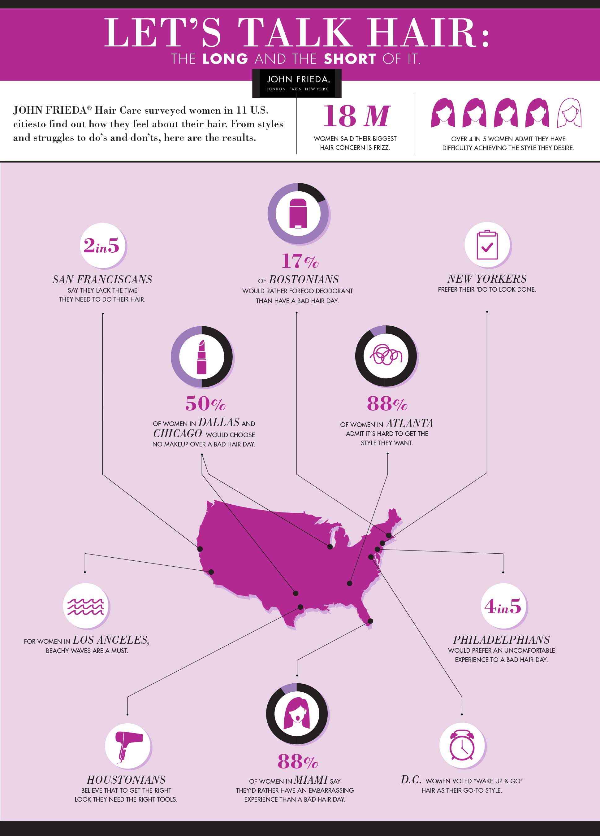 - En Miami, el 88% de las mujeres dicen que prefieren enfrentar una experiencia incómoda o embarazosa antes que tener un día desastroso para el cabello, y cuatro de cada cinco mujeres de Filadelfia coinciden.
