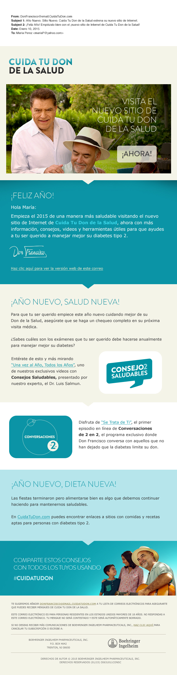 El sitio se actualizará en forma periódica con información que toma en cuenta las temporadas del año como estaciones y días festivos, tratando temas oportunos como consejos de acondicionamiento físico para las resoluciones de Año Nuevo y la adherencia a la alimentación sana durante los días festivos de Navidad. Habrá una página de opciones de tratamiento que permitirá a los visitantes optar por abandonar el sitio web de ‘Cuida tu Don’ y ver otras propiedades en línea de Boehringer Ingelheim sobre tratamientos médicos específicos para la diabetes tipo 2.