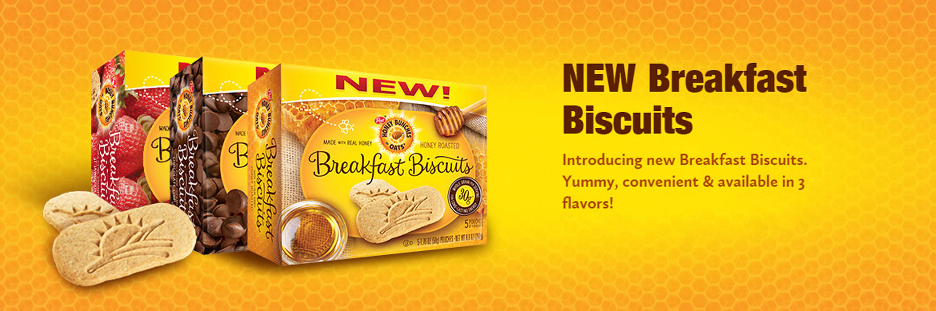 Las nuevazas galletitas Honey Bunches of Oats Breakfast Biscuits, están disponibles en tres sabores deliciosos: Honey Roasted (con sabor a miel), Strawberry (con sabor a fresa) y Chocolate Chip (chispas de chocolate). Cada paquete individual de cuatro galletitas crujientes proporciona más del 55 por ciento de los requerimientos diarios de granos integrales, 4 gramos de fibra y 5 gramos de proteína. Honey Bunches of Oats Breakfast Biscuits ofrecen una nueva opción para el desayuno que es nutritiva y conveniente.