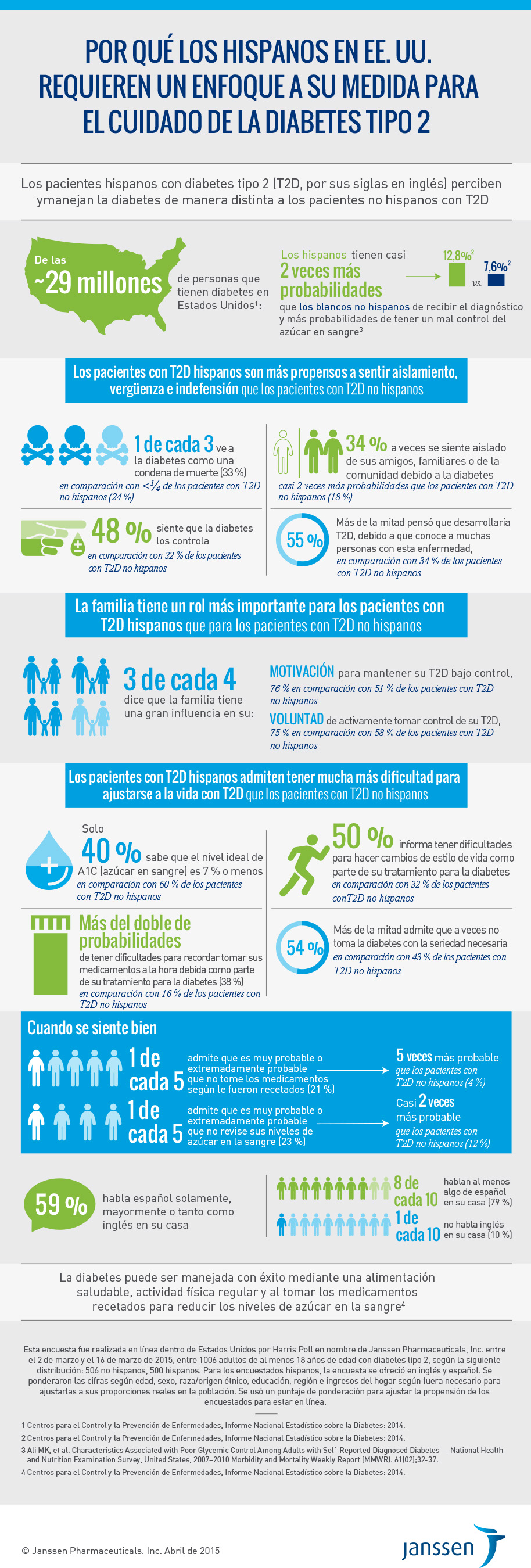 La encuesta sobre las percepciones de los hispanos fue realizada en línea dentro de Estados Unidos por Harris Poll en nombre de Janssen Pharmaceuticals, Inc. entre el 2 de marzo y el 16 de marzo de 2015 con 1006 adultos de al menos 18 años de edad con diabetes tipo 2, e incluyó la siguiente distribución: 506 no hispanos, 500 hispanos. La encuesta se ofreció en inglés y en español a los encuestados hispanos. Se ponderaron las cifras según edad, sexo, raza/origen étnico, educación, región e ingresos del hogar, cuando fuera necesario para ajustarlas a las proporciones reales en la población. Se usó un puntaje para la propensión para ajustar por la propensión de los encuestados para estar en línea.