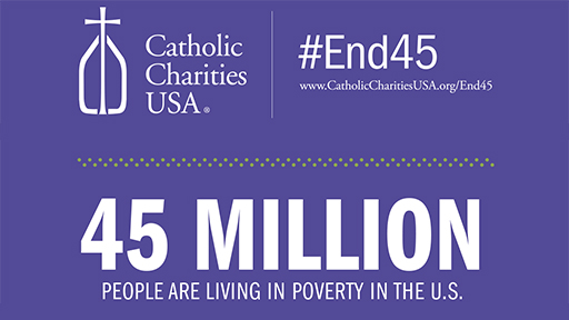 En la actualidad, cuarenta y cinco millones de personas, o 1 de cada 7 estadounidenses, viven en la pobreza en los Estados Unidos. A menudo una pequeña desgracia o no cobrar el sueldo una vez es suficiente para cambiar la vida de una persona o de una familia y hacer que caiga debajo de la línea de pobreza. Catholic Charities USA (CCUSA) lanza hoy #End45 (No más 45): Levanta la mano para acabar con la pobreza en los Estados Unidos, una iniciativa nacional para centrar la atención pública en el problema de la pobreza y los millones de personas que pasan necesidades o no pueden llegar a fin de mes.[1]