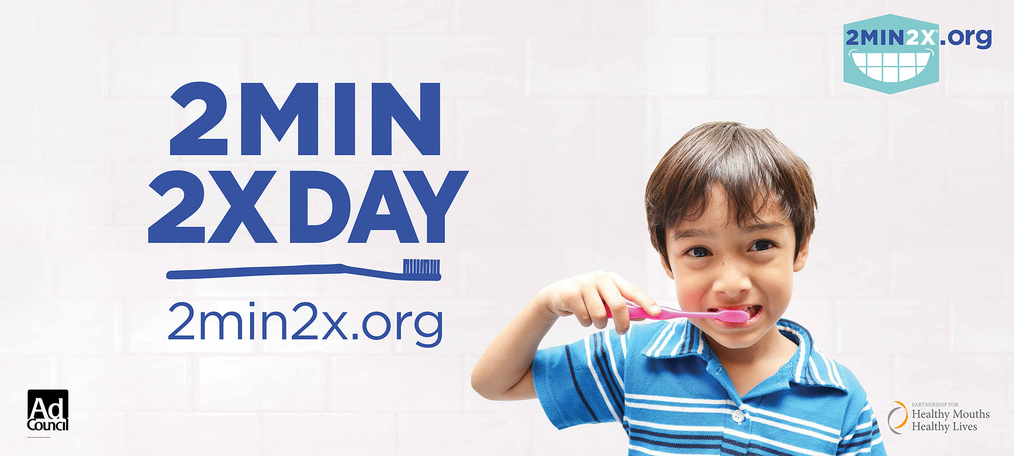 La actual campaña Kids' Healthy Mouths incluye una serie de anuncios públicos que alientan a los padres a hacer que sus hijos se cepillen los dientes durante dos minutos, dos veces por día. Creada pro bono por la agencia de publicidad Grey New York, la campaña presenta graciosas descripciones de lecciones de vida que señalan que si bien el rol de los padres puede ser complicado a veces, lograr que los niños se cepillen los dientes correctamente puede ser más fácil que muchas otras cosas que los padres tratan de enseñar a los hijos. Todos los materiales de campaña se dirigen a 2min2x.org.