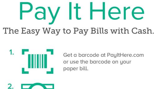 - Pay It Here (Páguela Aquí) permite a los consumidores que usan efectivo pagar cuentas de miles de proveedores de servicios en efectivo con un código de barra en muchos locales de venta al detalle en todo el país. Los consumidores pueden descargar un código de barra en PayItHere.com o presentar el código de barra en su cuenta en papel en un local de venta al detalle participante.